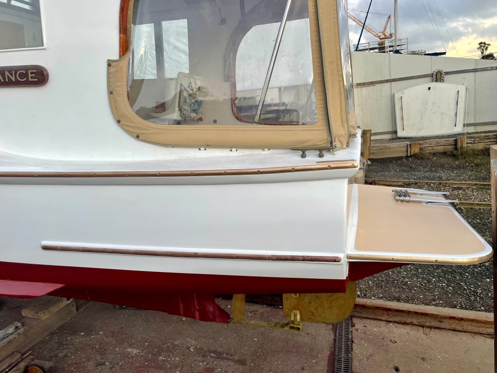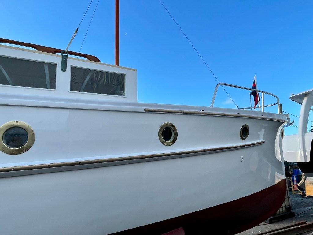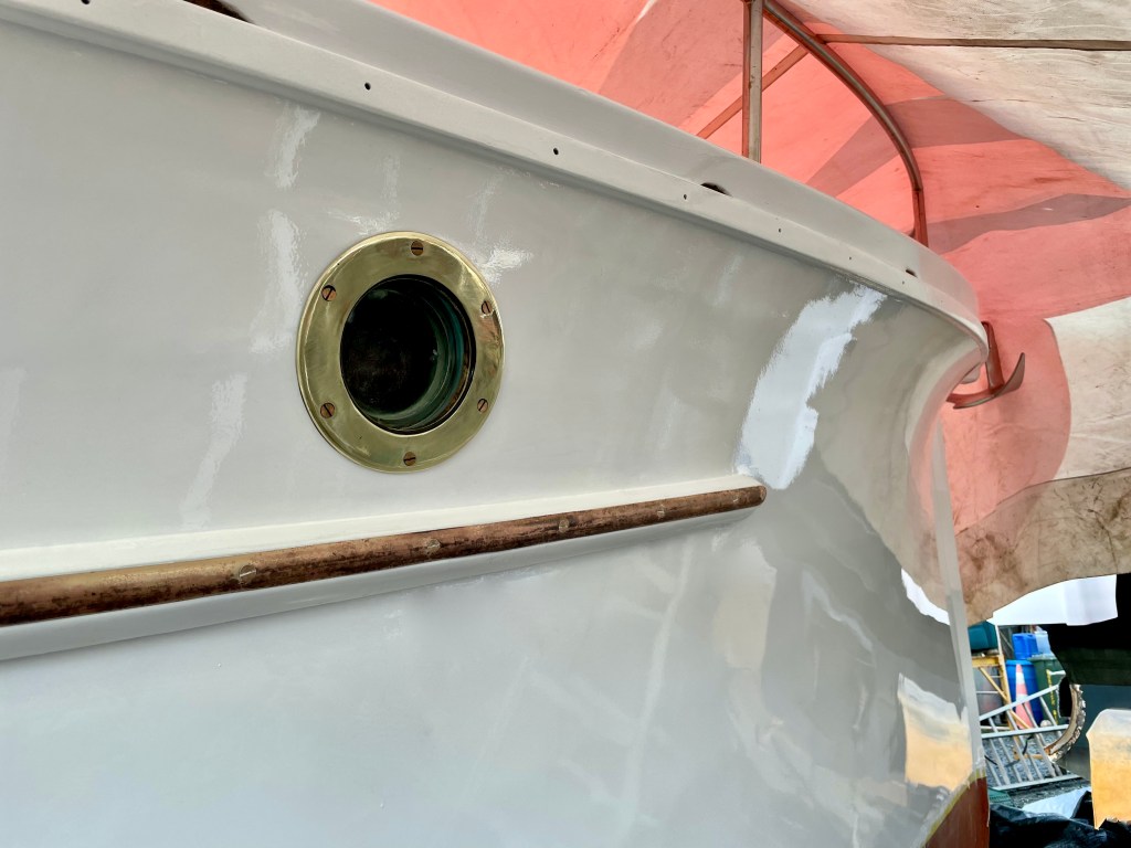 Her new owners were newish to classic craft and over the next 4 years undertook a rolling restoration / refit – lots of system upgrades and corrected some deferred maintenance. Work included removal and full service of anchor windlass, replacement of 7 windows, with 8mm toughened, new engine mounts, exhaust, hull repaint, replacement of nav lights and wiring, fitting of bow thruster, new anchor chain & anchor and new Lawrence plotter/sounder.
