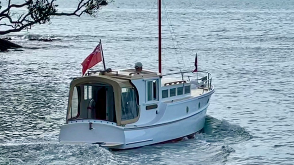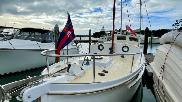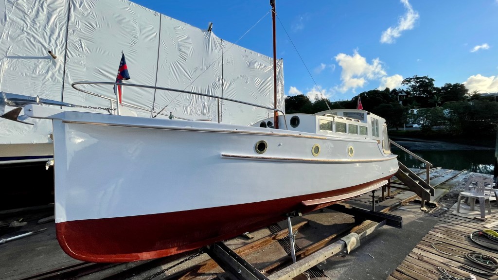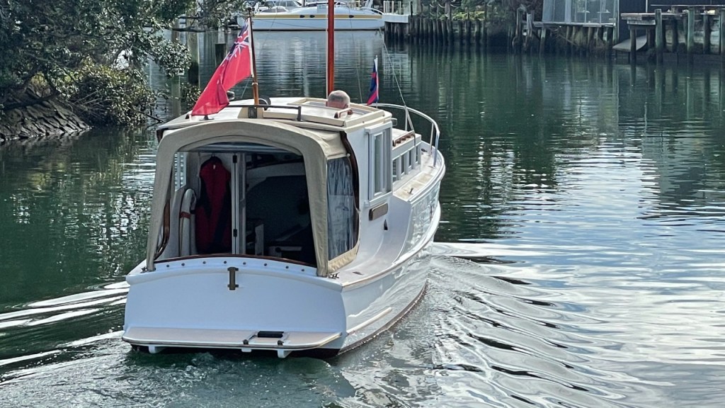 As per most of Roy Paris’s builds forward motion is via a 120hp Ford 2715, non-turbo. With her semi displacement hull, the 120hp sees her comfortably cruising at 9 knots, with a top speed of approx. 14 knots. Construction is carvel planked kauri. Her beam is just short of 10’ and she draws 3’3”. (Fits a 10.5m marina berth).