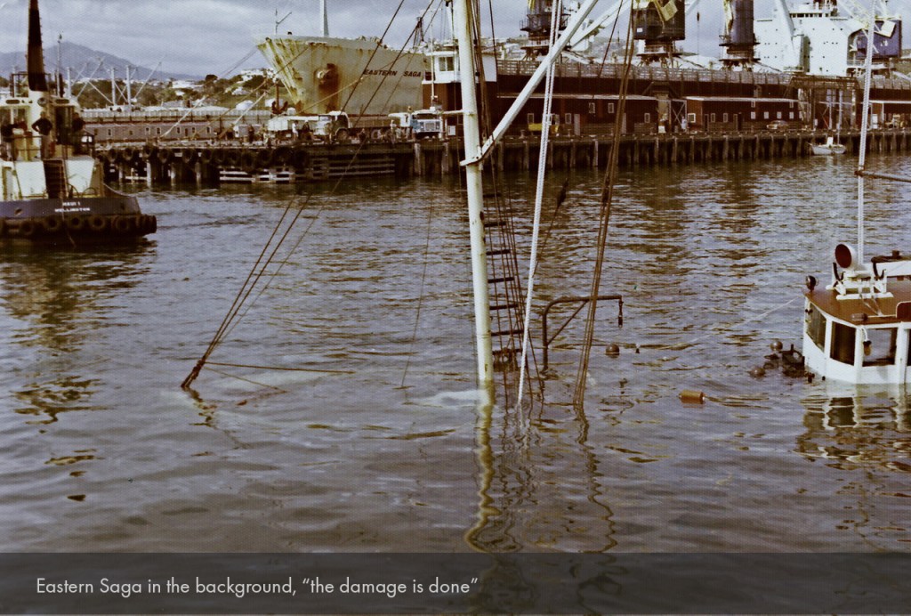 “About November 1975 Frank Derbyshire and I arrived at Port Taranaki from Picton having successfully tendered for the fishing vessel ‘Joan’ and her equipment. ‘Joan’ was moored alongside the wharf when struck by the bulbous bow of the phosphate ship “Eastern Saga” as the ship was being manoeuvred in the harbour. Joan suffered extensive damage and was crushed about amidships.