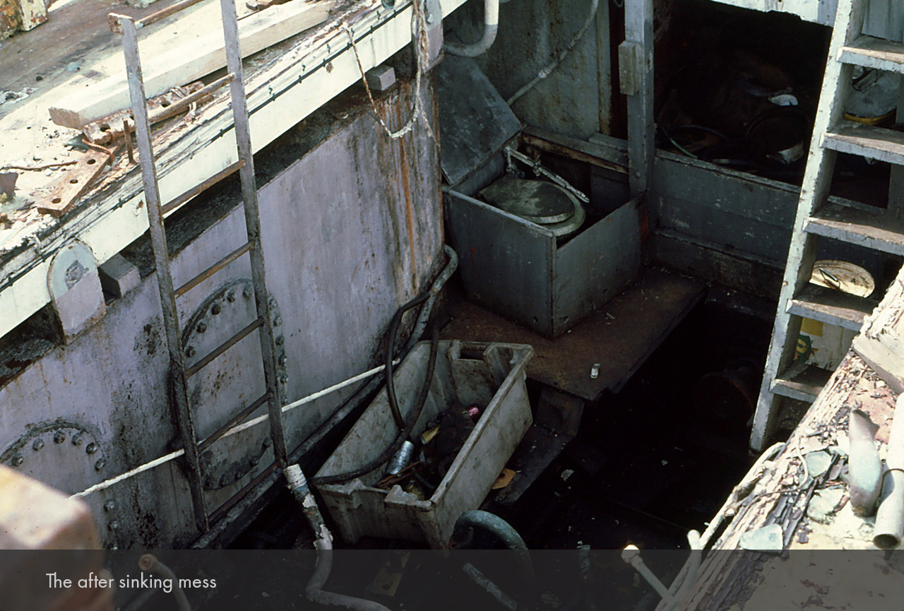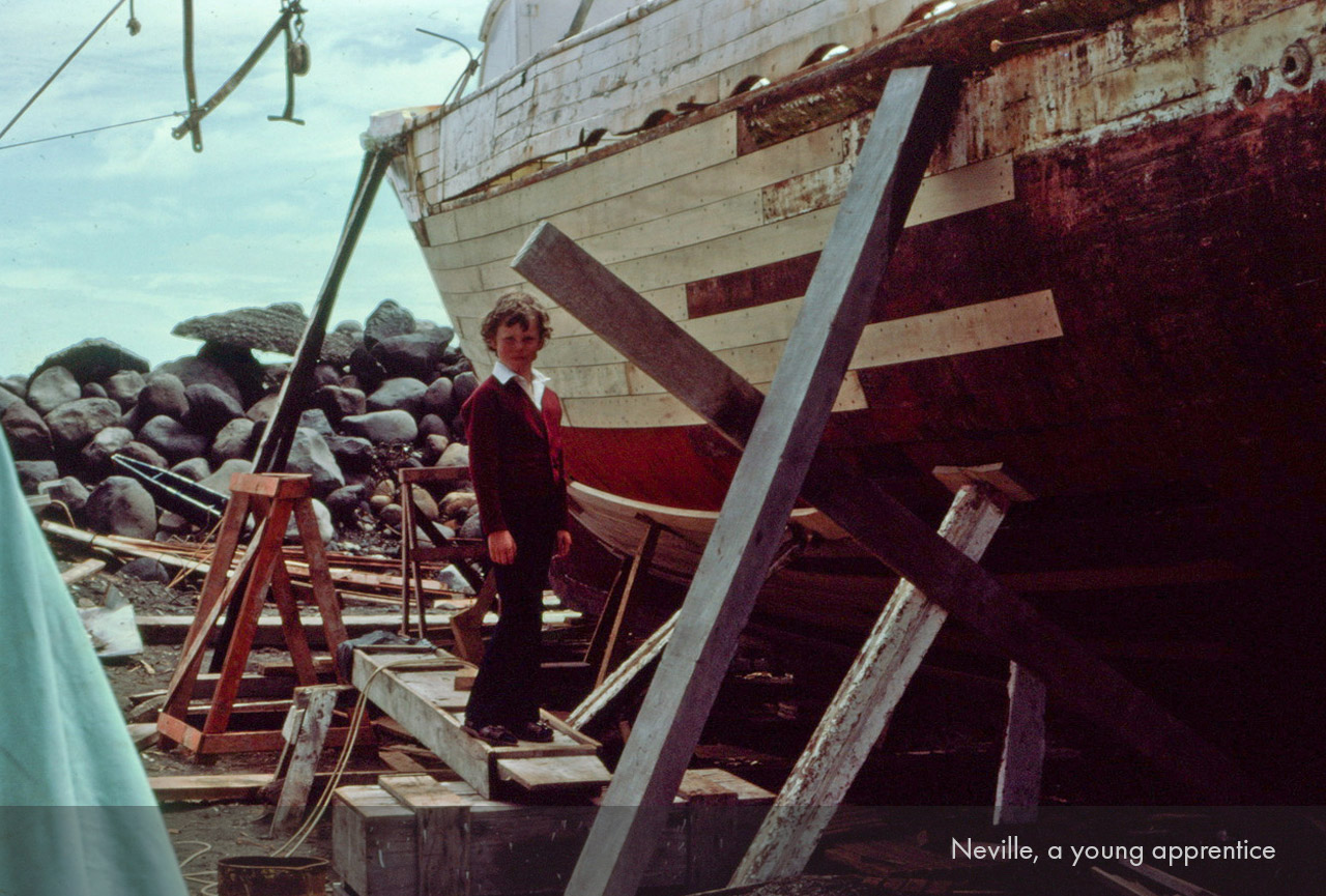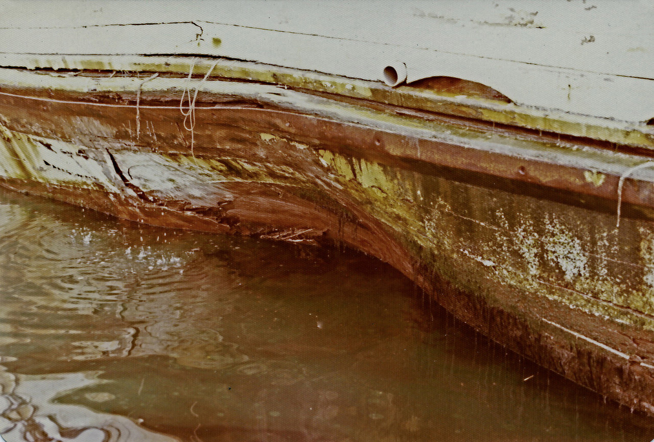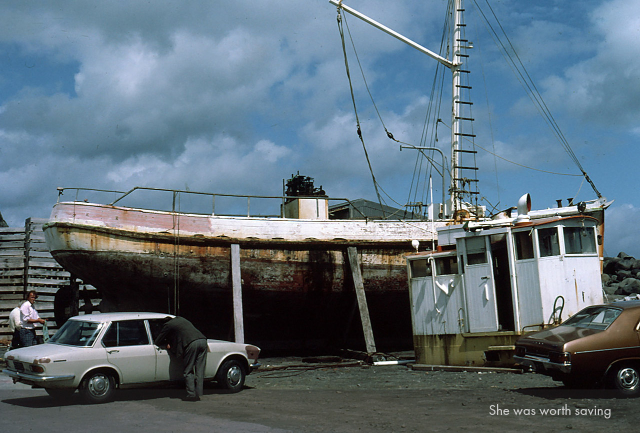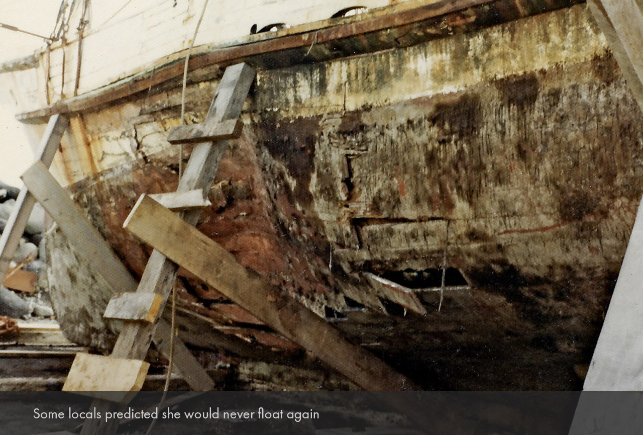 The deck covering board was forced up during the impact but not damaged, we pulled this down into place, repaired the bulwarks, and from memory I think we replaced the outer planking with White Pine ( Kahikatea ) and Australian hardwood for the new belting, Metalex was a good wood preservative we used in those days, and red lead for priming paint.