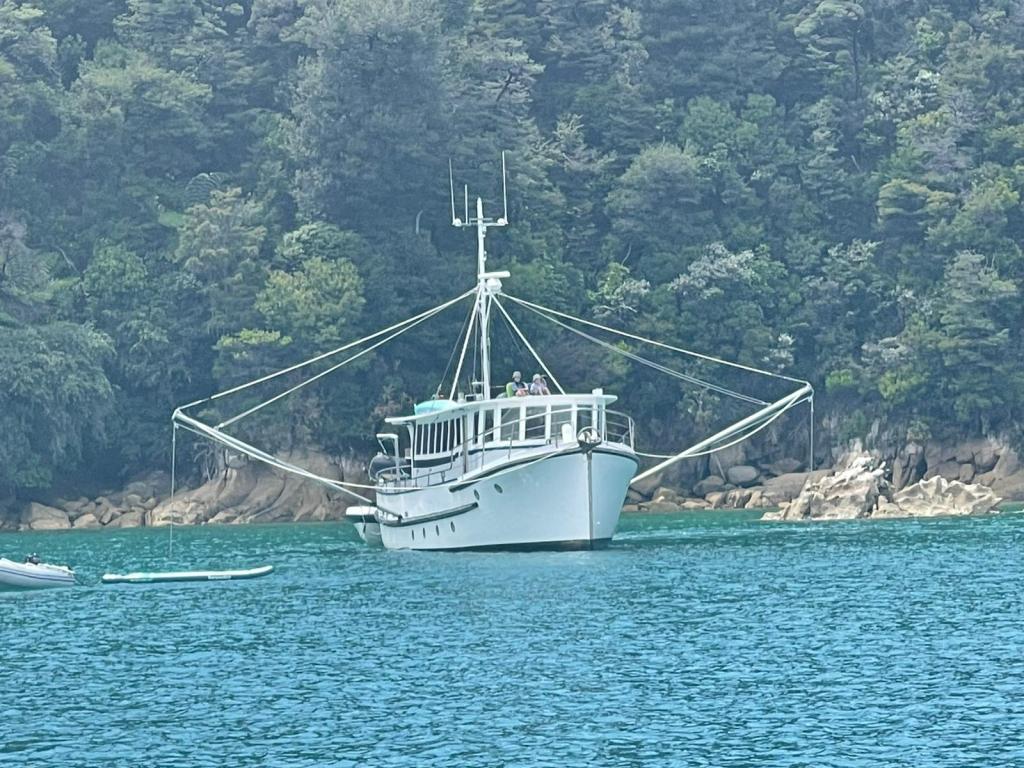 With completion of repairs and a new Marine Department survey we left New Plymouth late afternoon bound for the Marlborough Sounds with Frank Roper aboard. Frank had fished the coast south to Cape Egmont and he regaled us with stories of fishing in the days of long lining before depth sounders, when after catching the fish they cleaned and gutted the catch on the way home.”