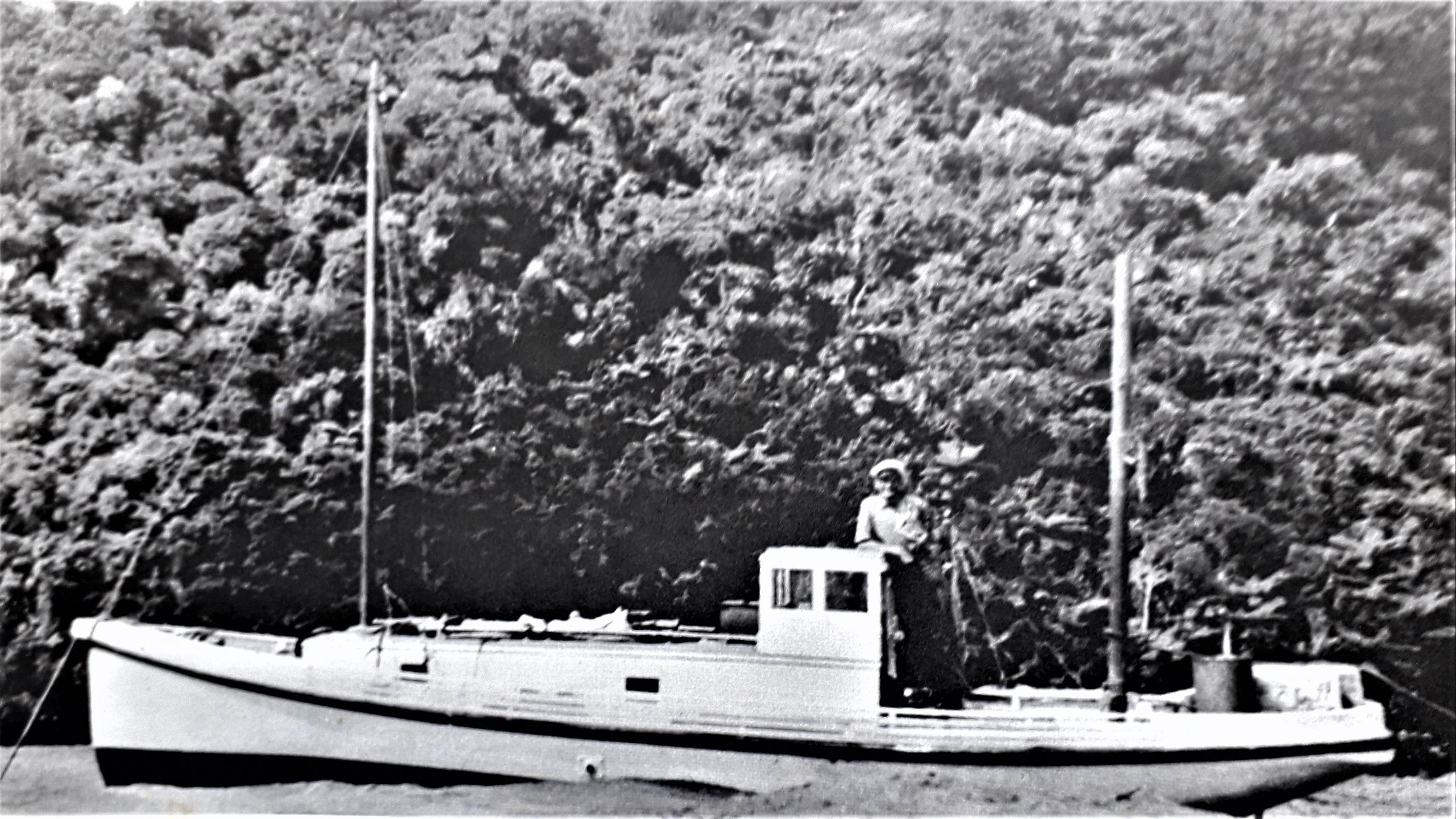 As to the vessel – my monies on VAGABOND – photo below and previous WW story links. VAGABOND was built / launched by Joe Jukes in 1926. A ’sister’ ship to NEREIDES. Jukes yard was located in Balaena Bay, which adds weight to the photos location.