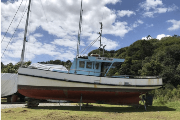 Saint Antonio is from the design board and builder – Joe Jukes of Wellington and was built in 1935. LOA is 40’ and she has the same stern profile as Wild Duck. Strongly built in single skin kauri, she is a typical straight stem, counter stern, Island Bay Cook Straight vessel.
