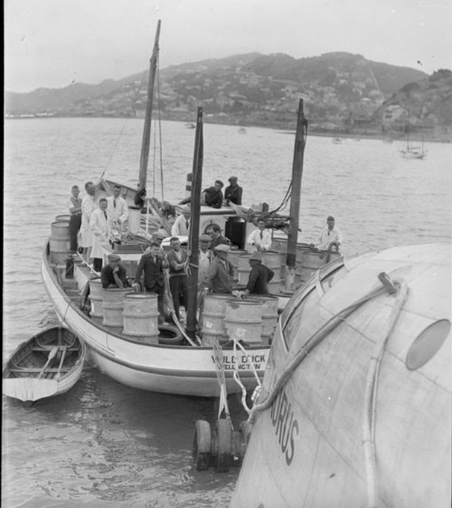 I also found several photos on the National Library website taken by Whites Aviation. The key photo is the one looking south, Kilbirnie hills in the right background. The flying boat in the lower right, centre Wild Duck stern on and another launch on starboard side tied up alongside (refer #2 below). There is also a bow on photo of Wild Duck on the left showing the side of another launch on the very left edge of the photo (refer #3 below). I am interested to know the name and whereabouts of the second launch and if it is still afloat. Based on all these photos I think it is my late fathers launch.