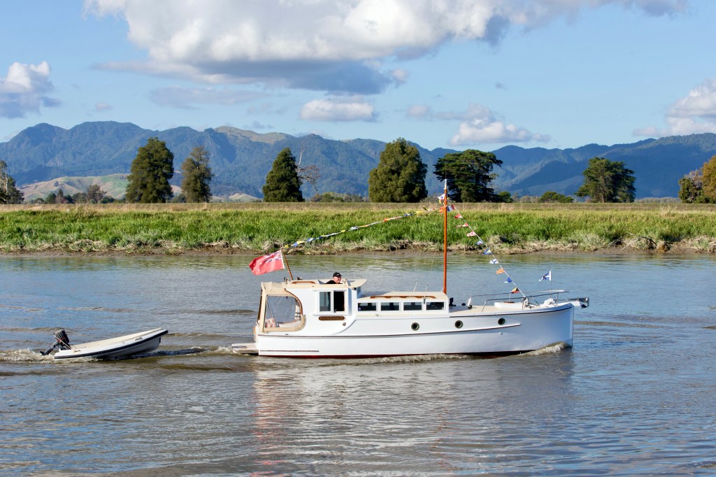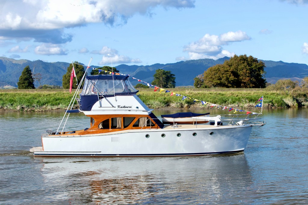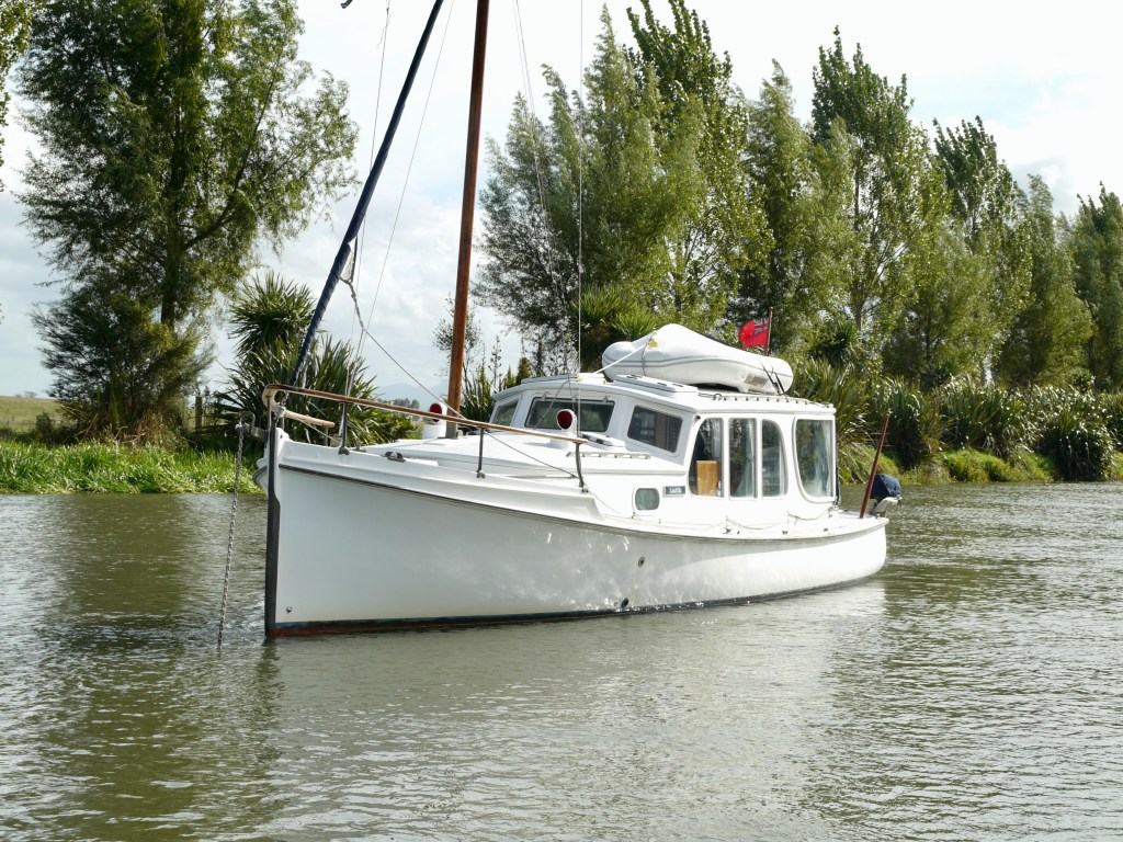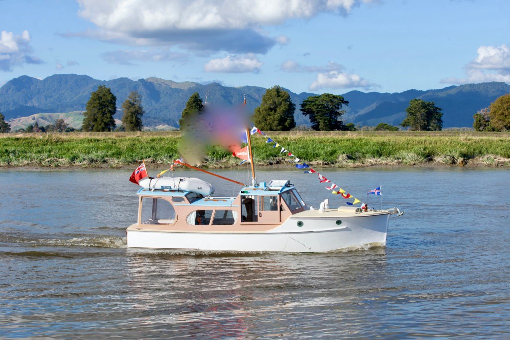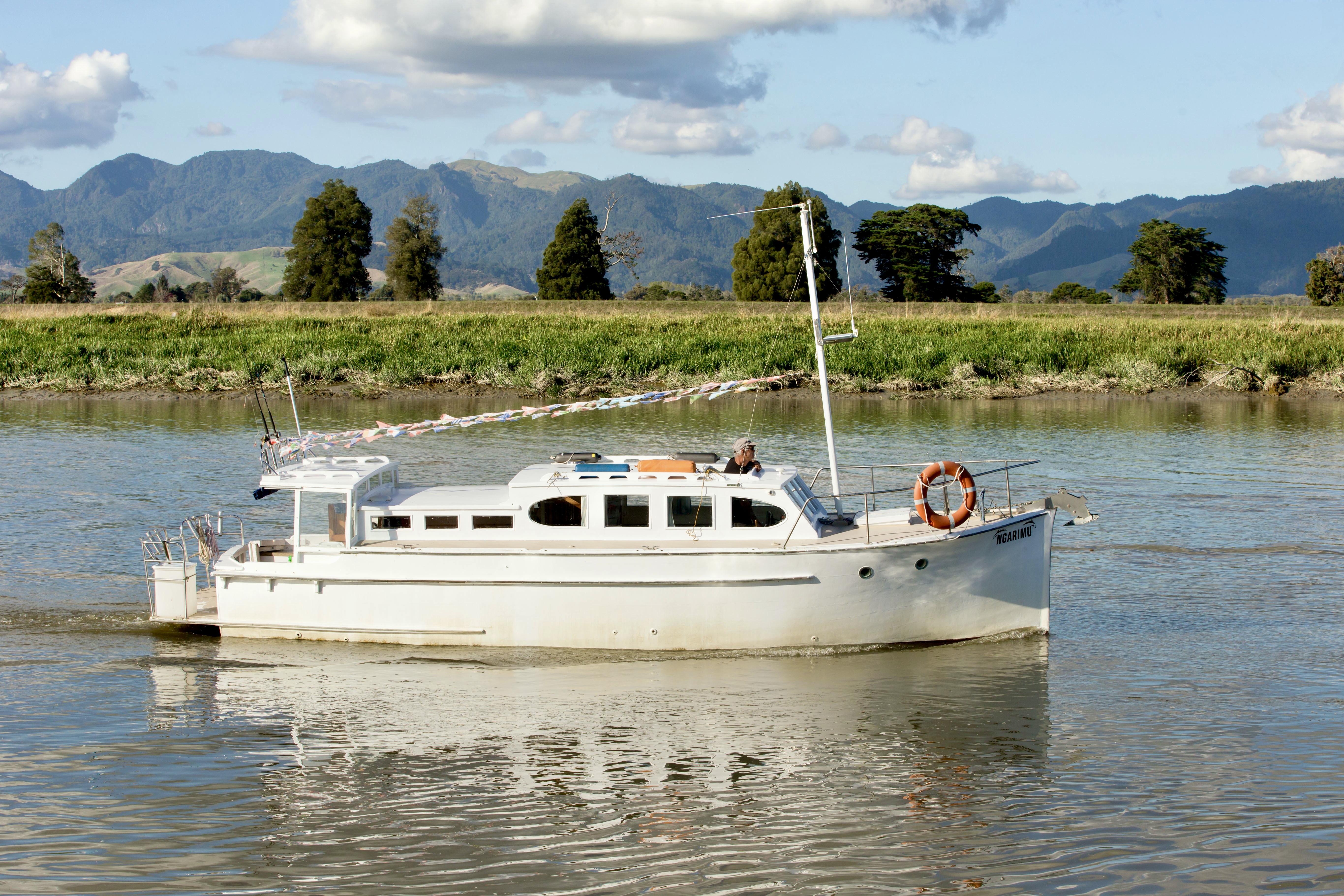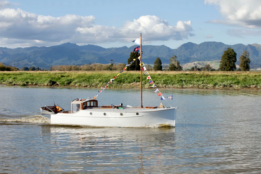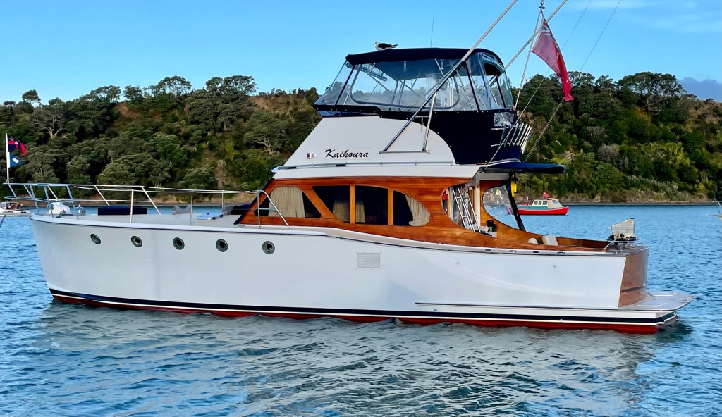 NGARUNUI was built in 1955 by Jim Young and started life, with a 1942 GM Detroit Marine Diesel engine (ex-war assets). It has now been fitted with a late model 200hp DOOSAN Diesel and has a Yanmar 20hp diesel auxiliary engine, with the prop for that engine mounted immediately above the main propeller.
