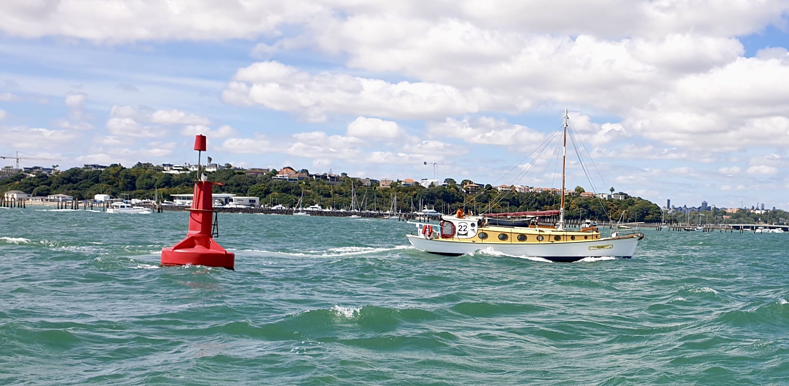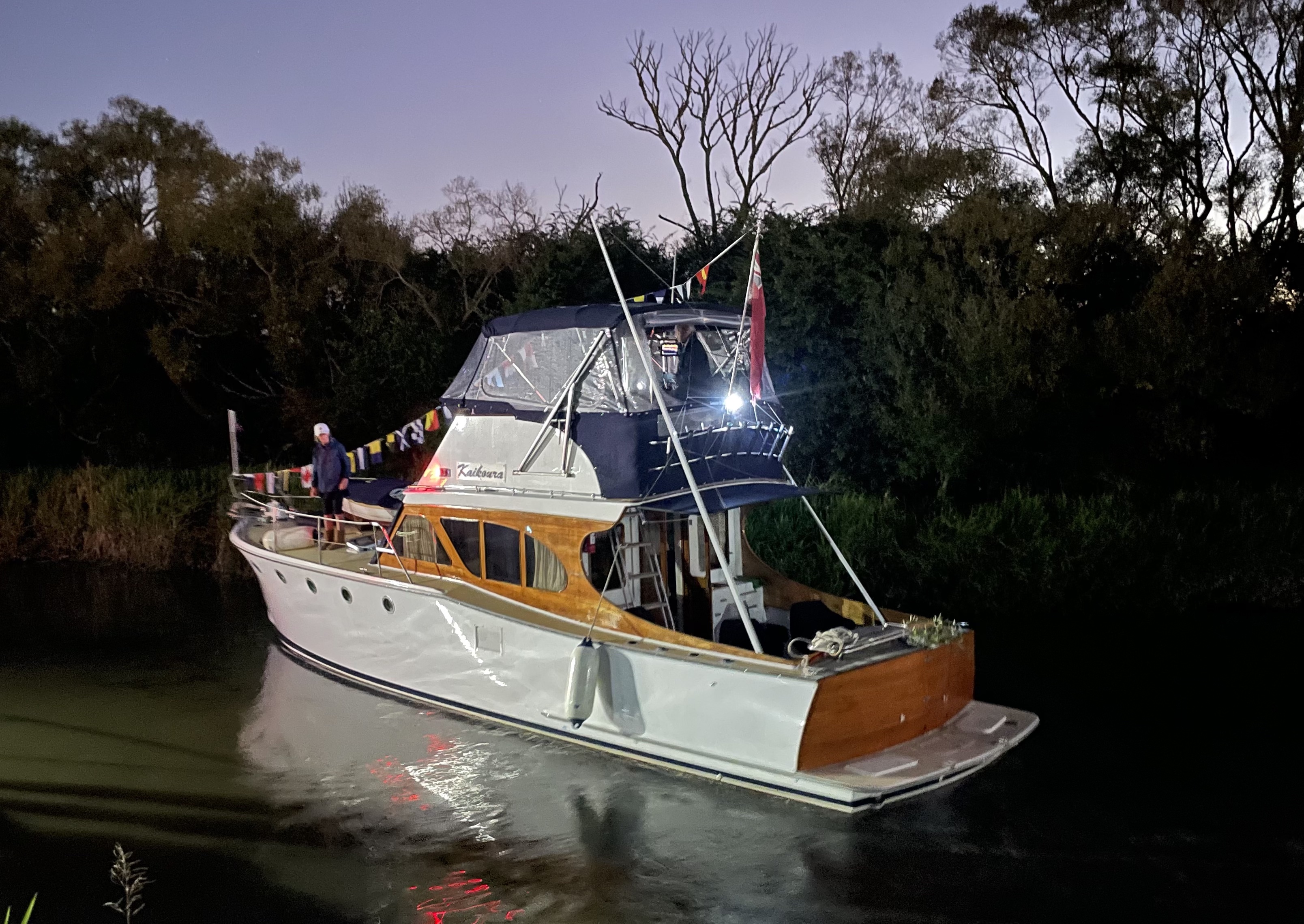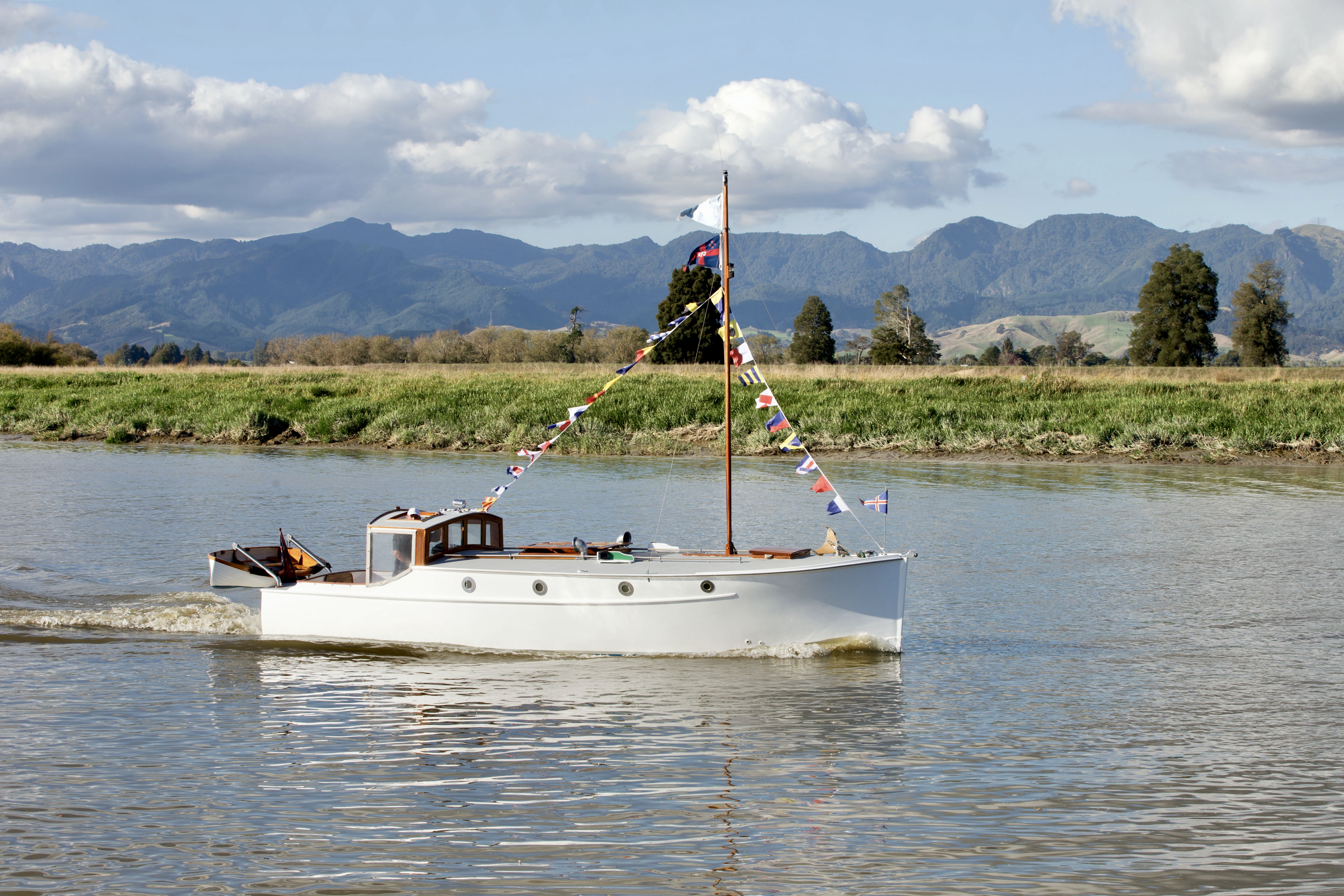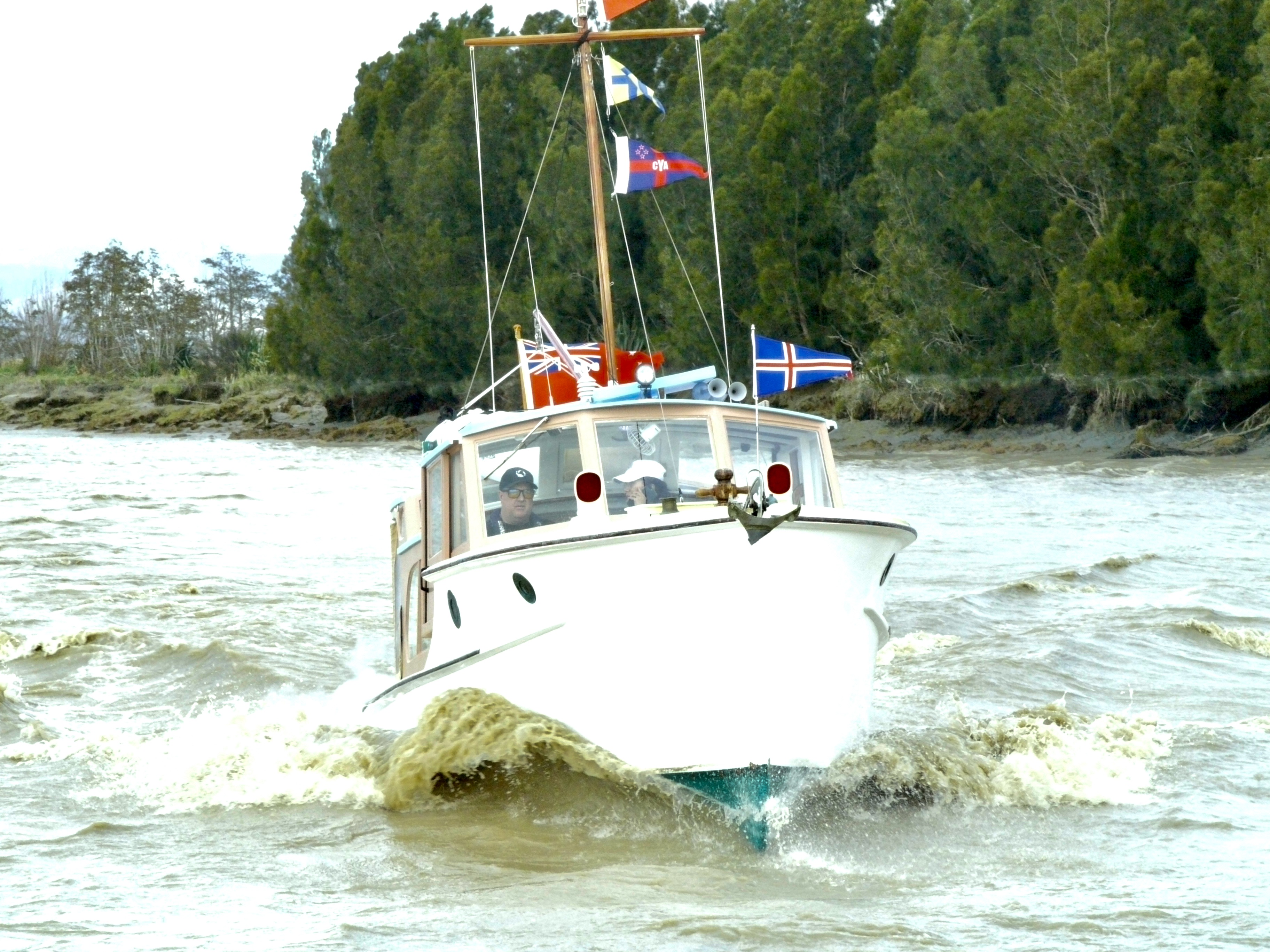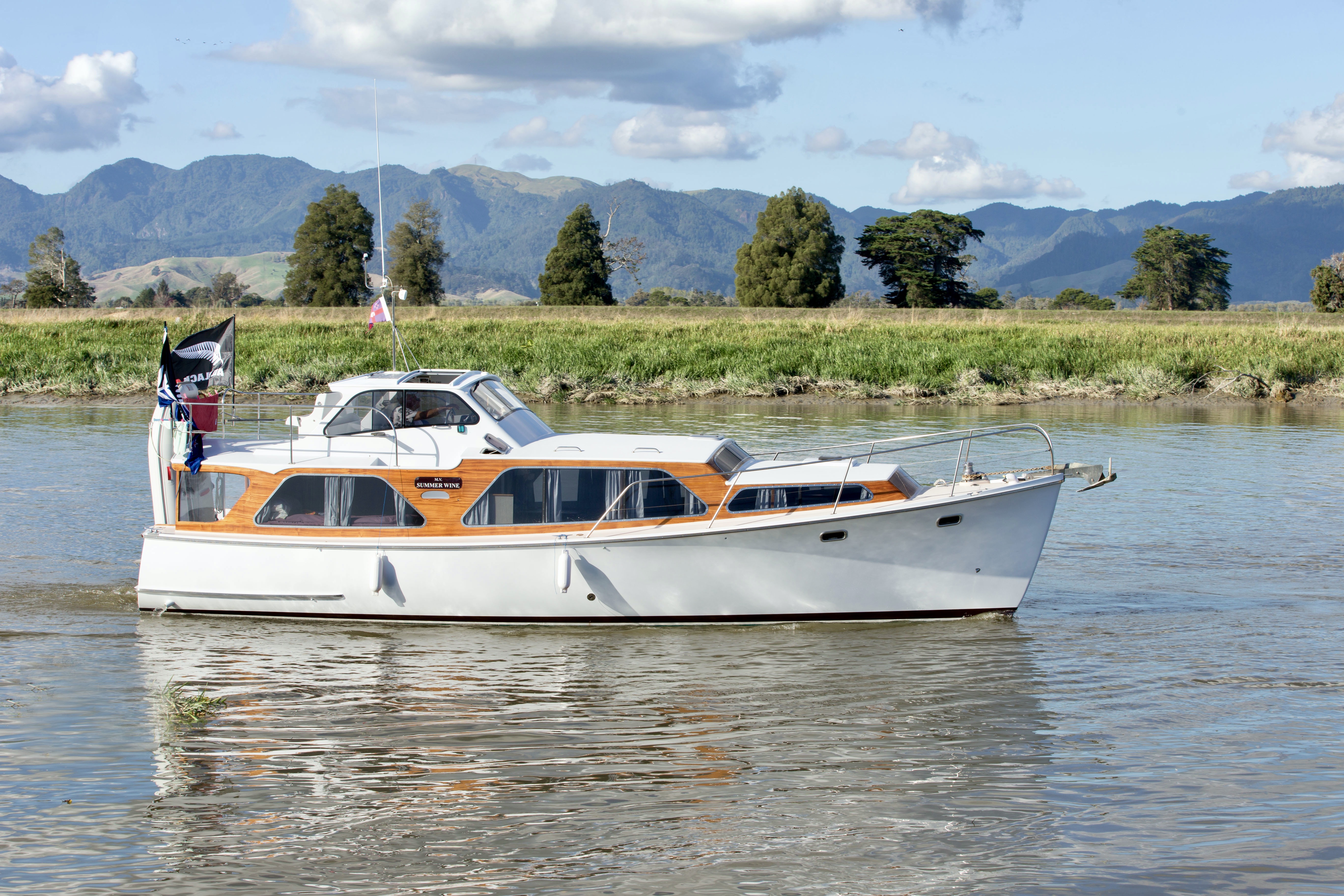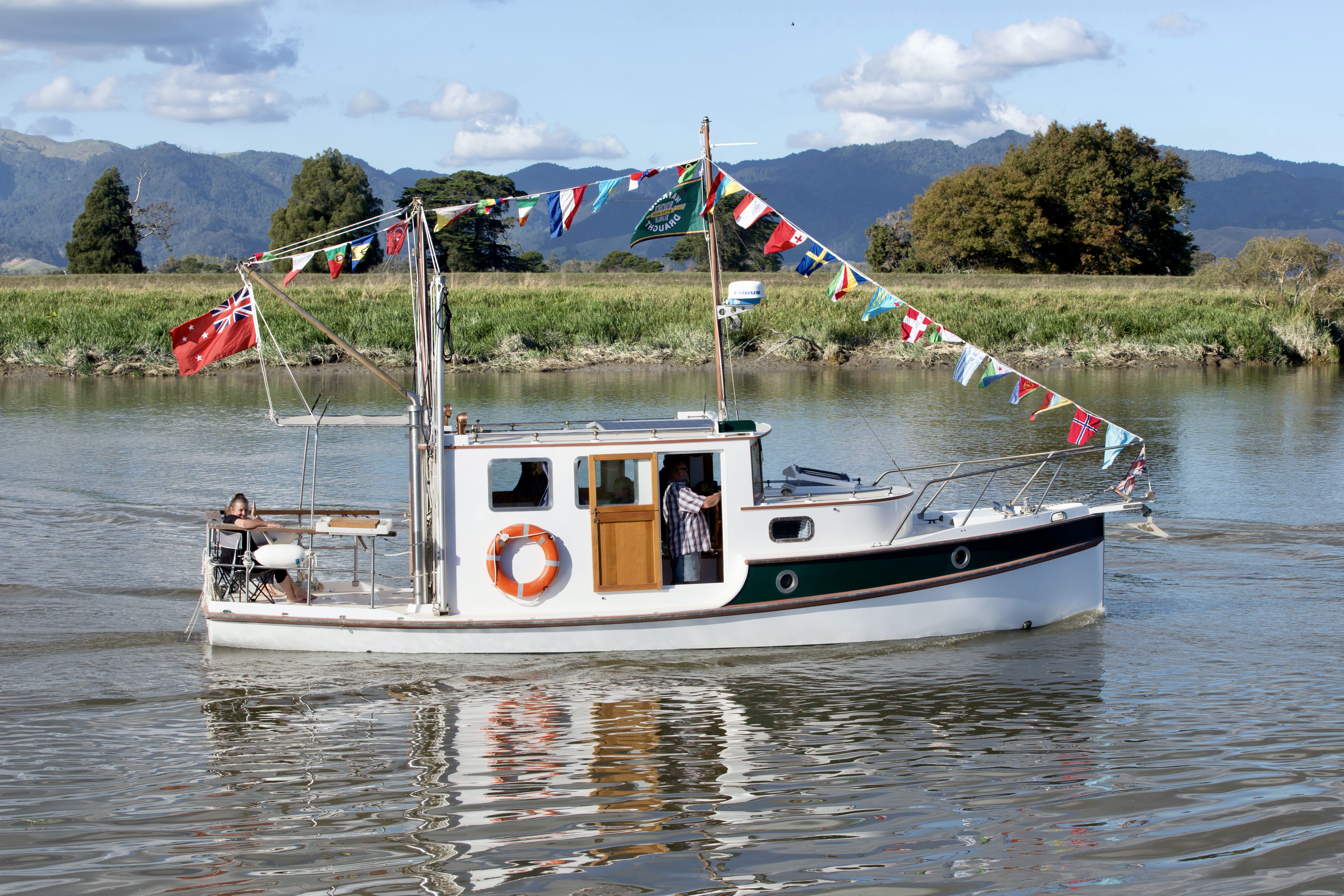 NGARUNUI was built in 1955 by Jim Young and started life, with a 1942 GM Detroit Marine Diesel engine (ex-war assets). It has now been fitted with a late model 200hp DOOSAN Diesel and has a Yanmar 20hp diesel auxiliary engine, with the prop for that engine mounted immediately above the main propeller.