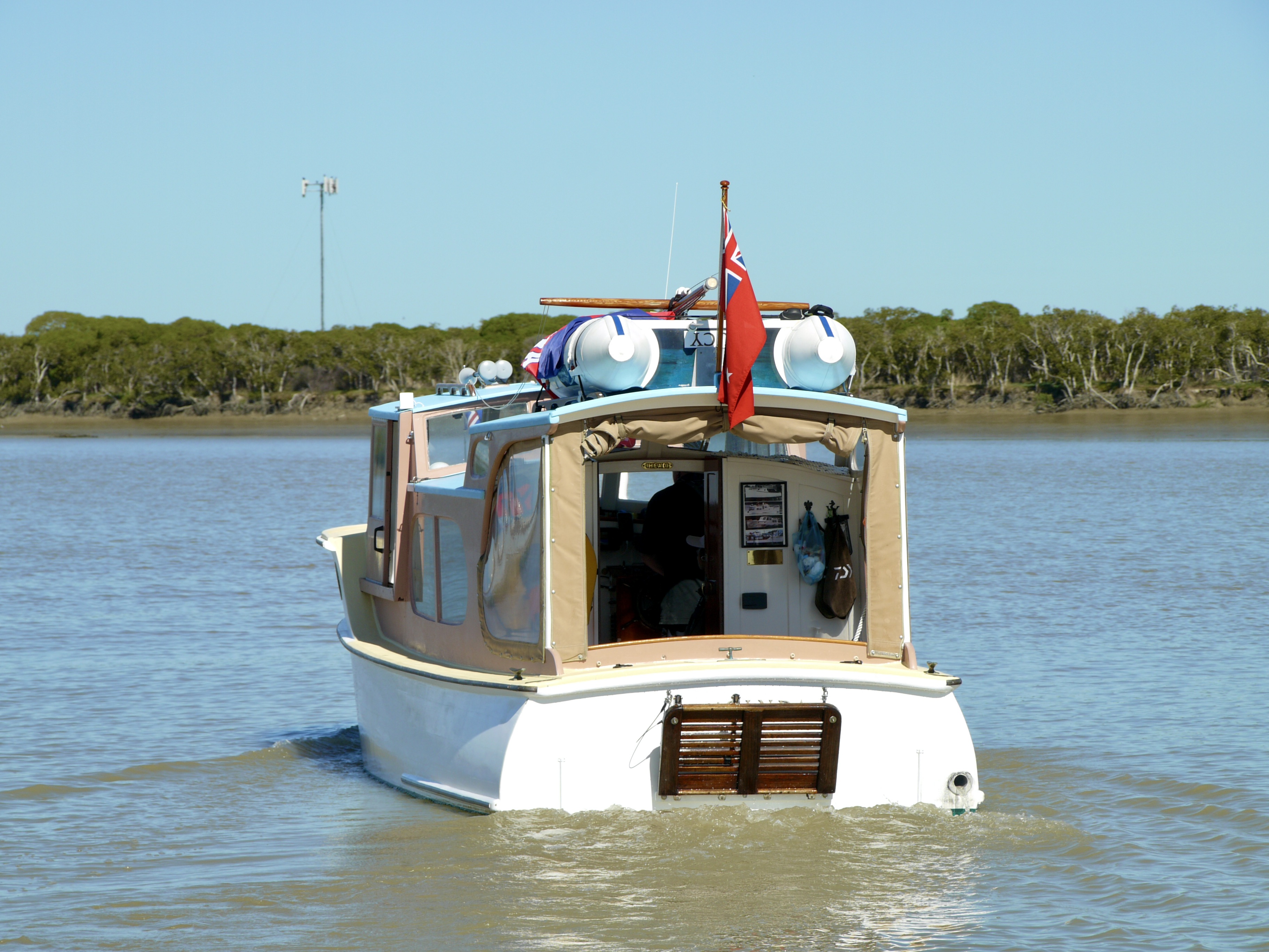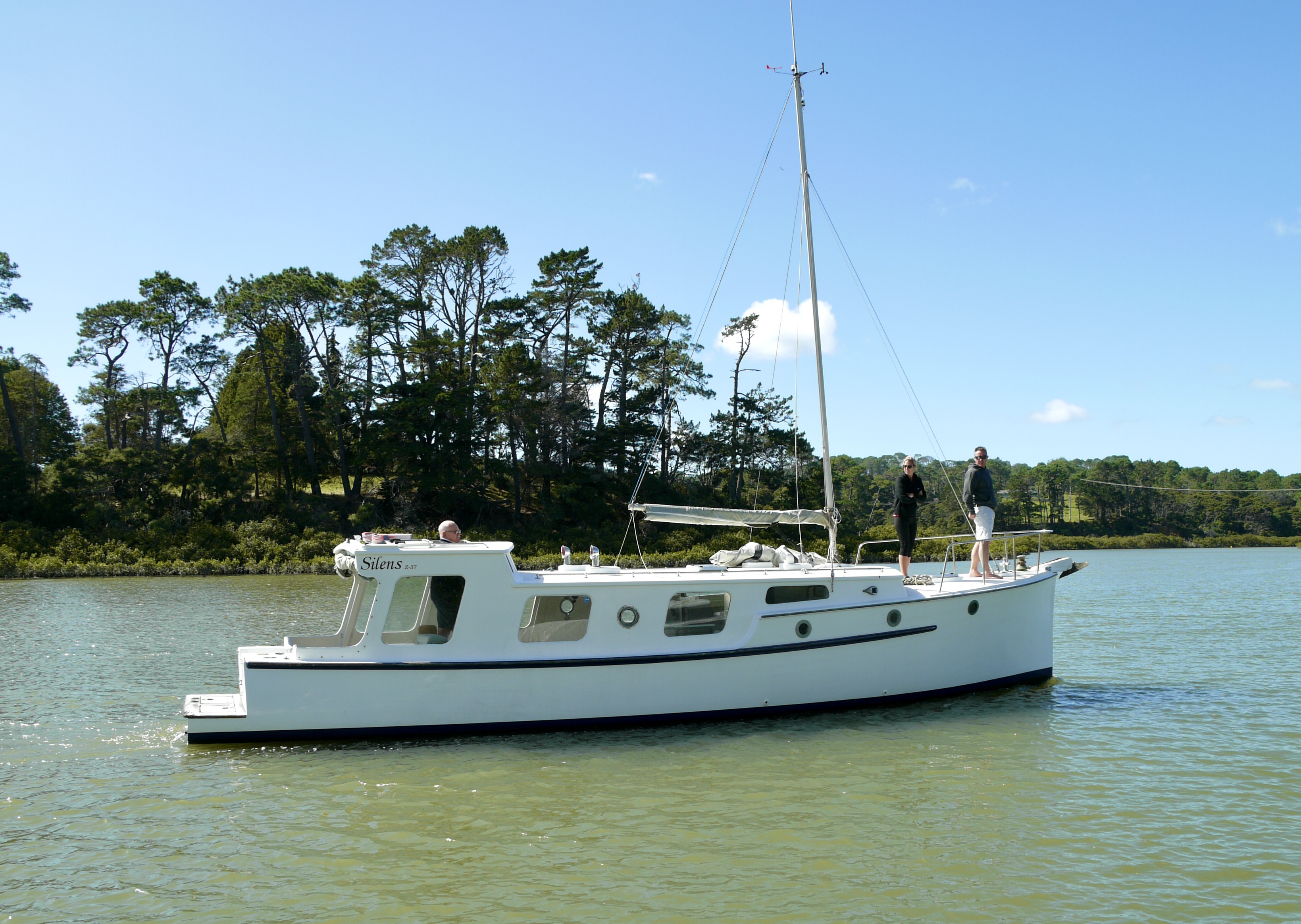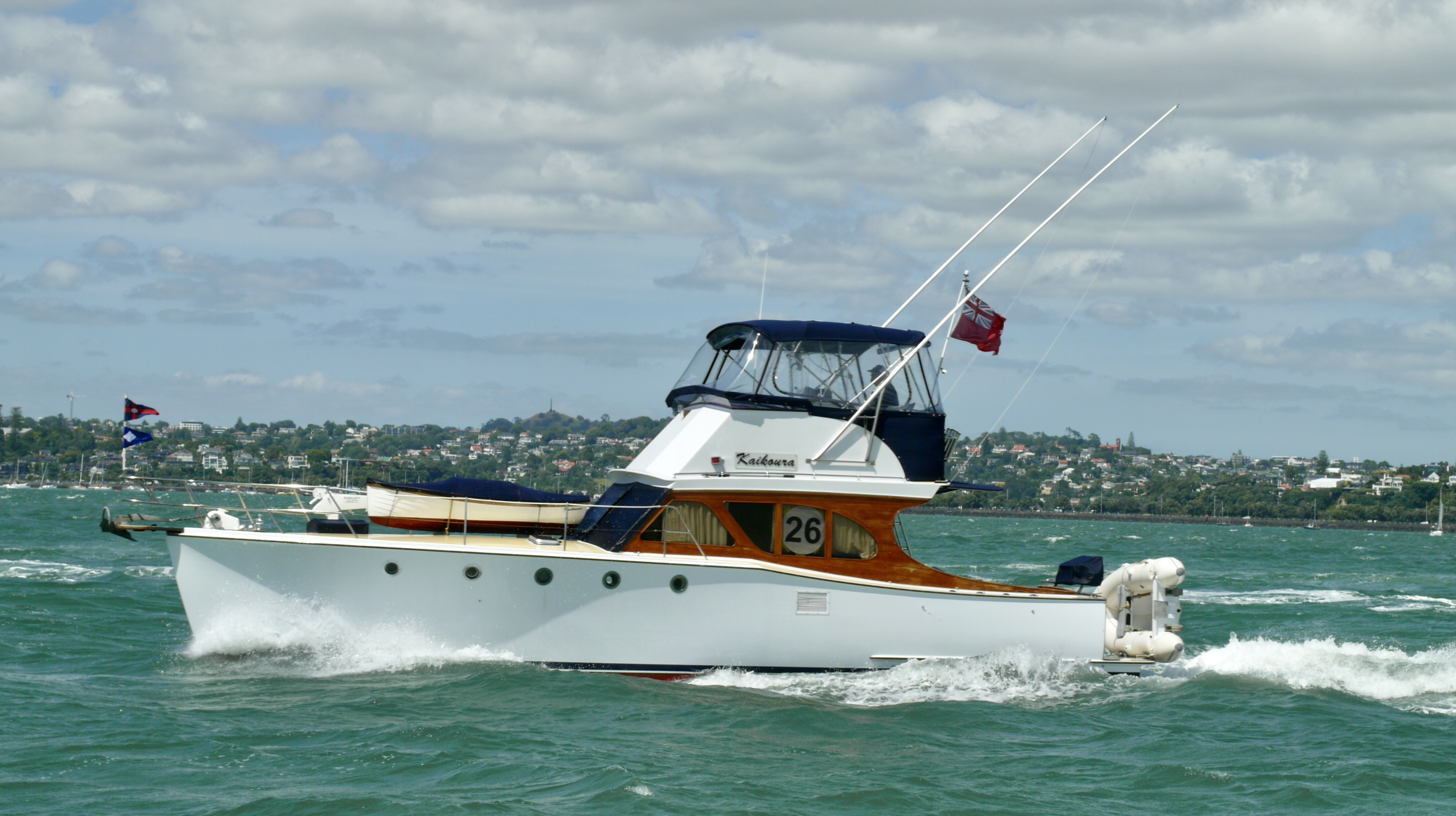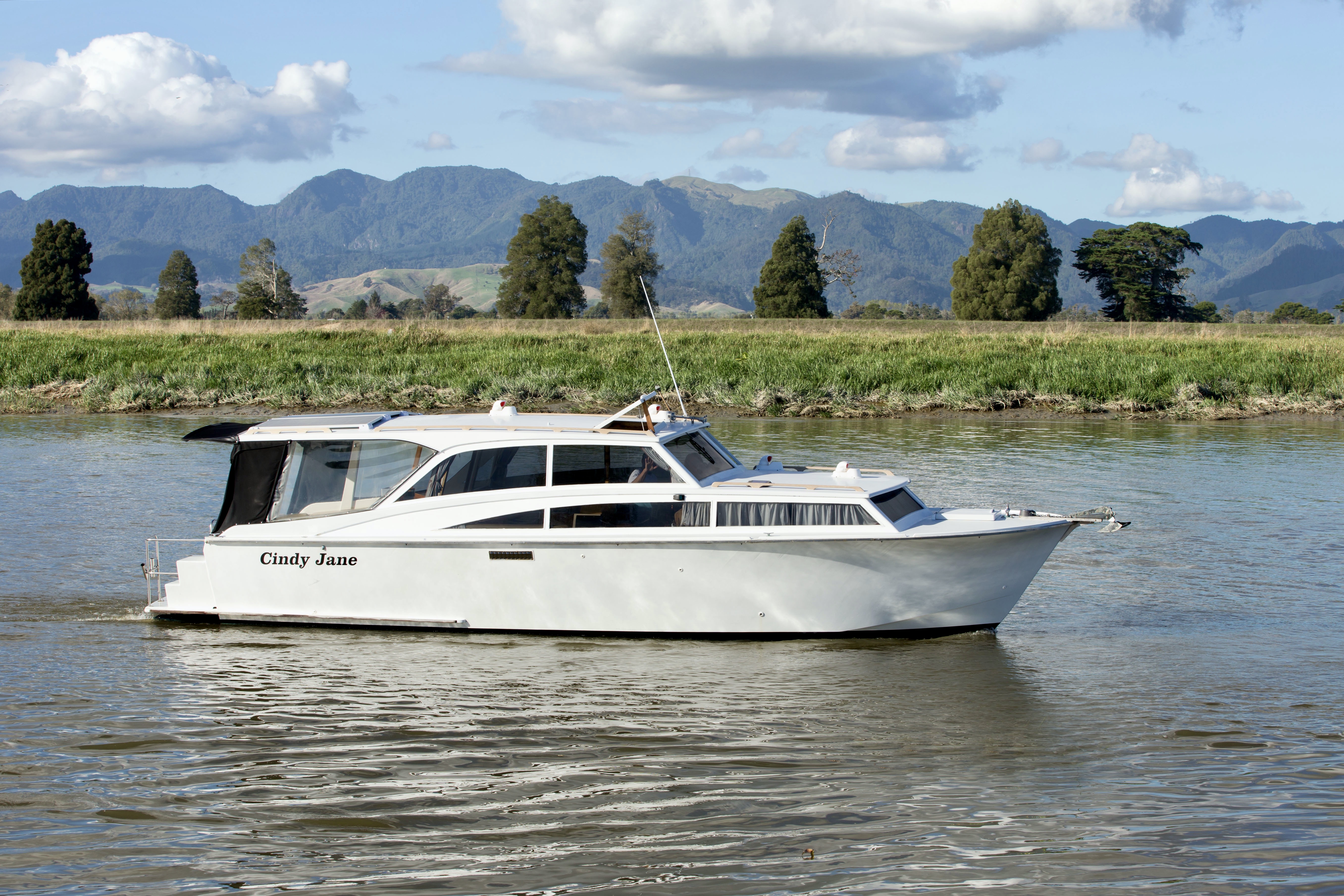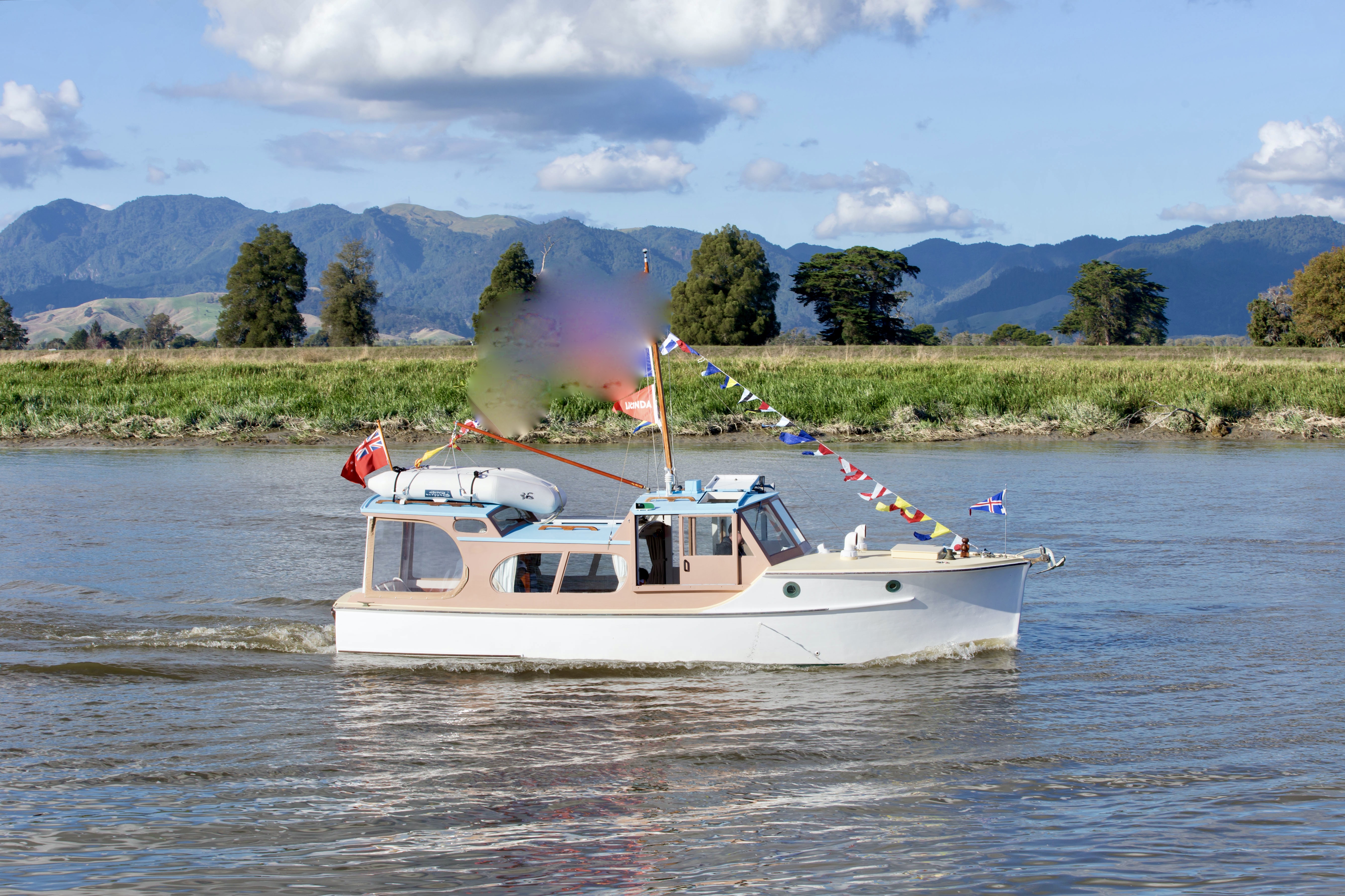 NGARUNUI was built in 1955 by Jim Young and started life, with a 1942 GM Detroit Marine Diesel engine (ex-war assets). It has now been fitted with a late model 200hp DOOSAN Diesel and has a Yanmar 20hp diesel auxiliary engine, with the prop for that engine mounted immediately above the main propeller.