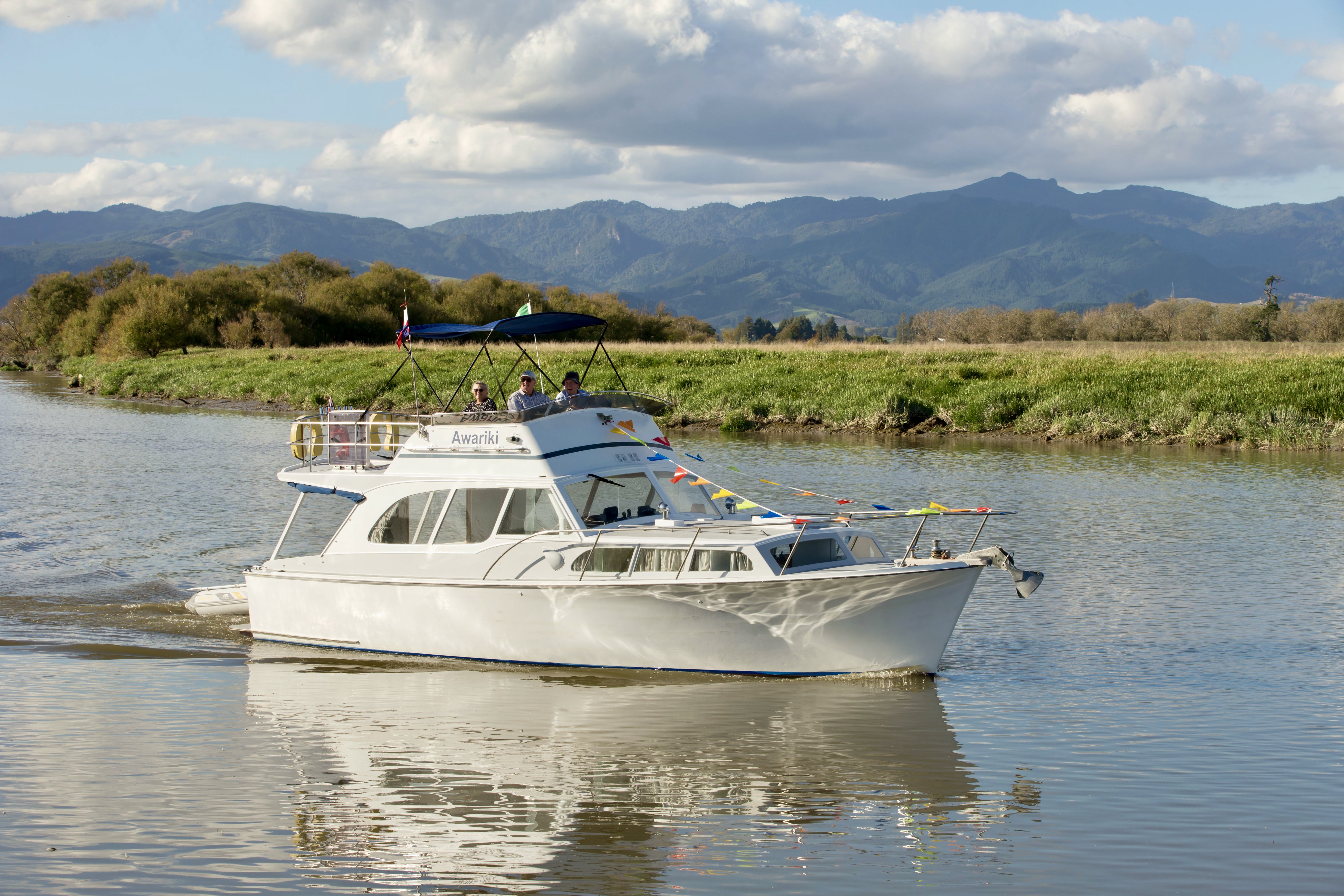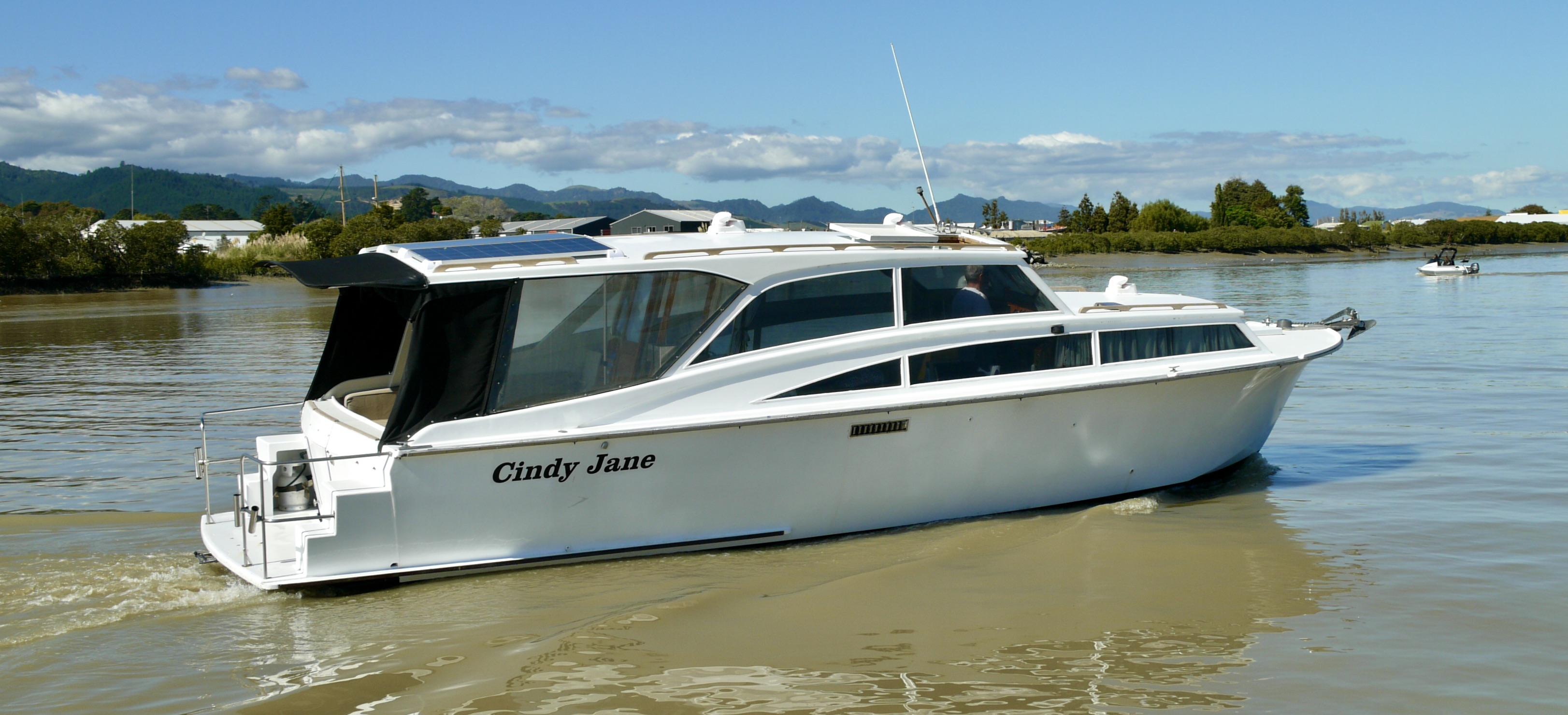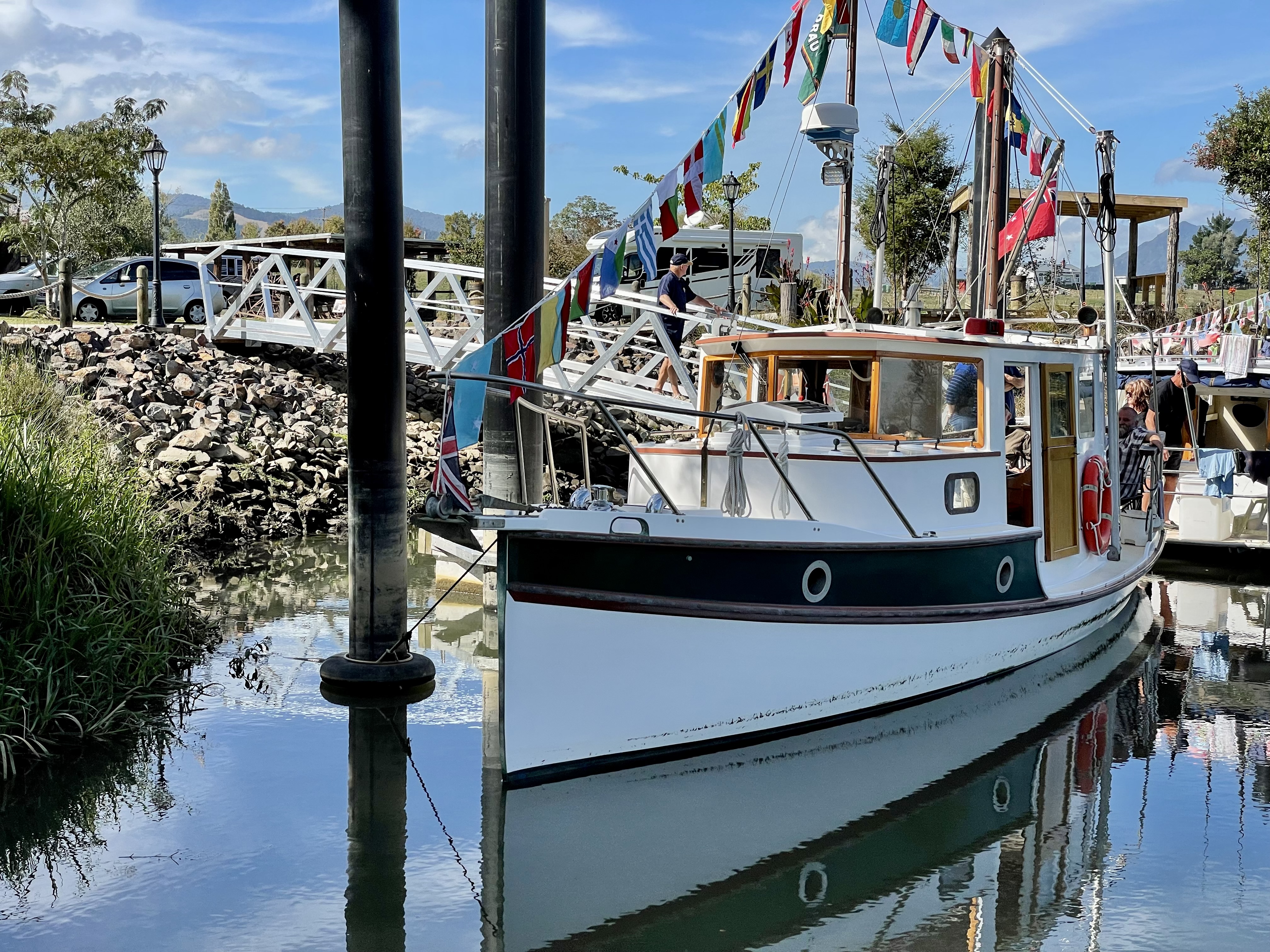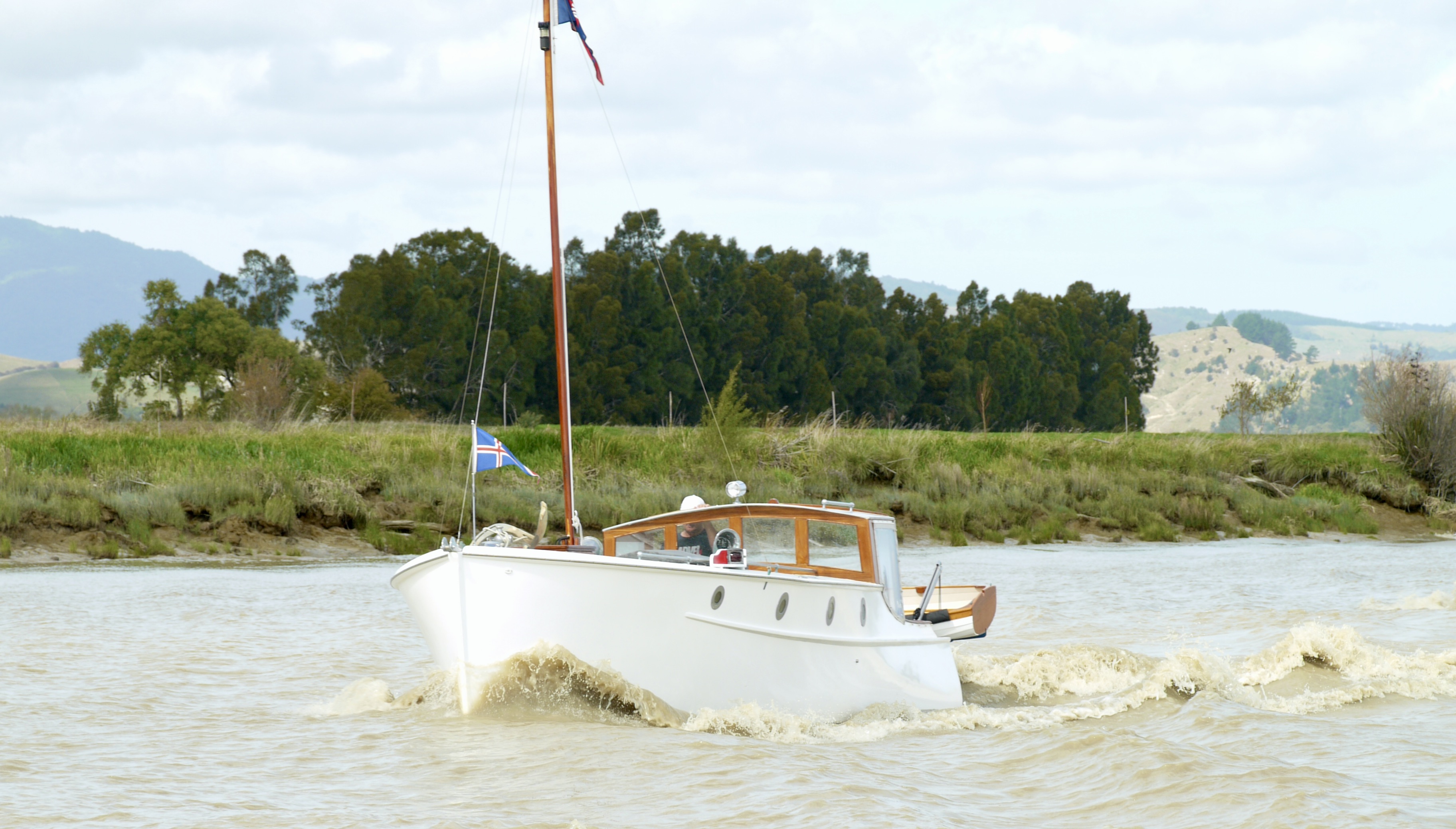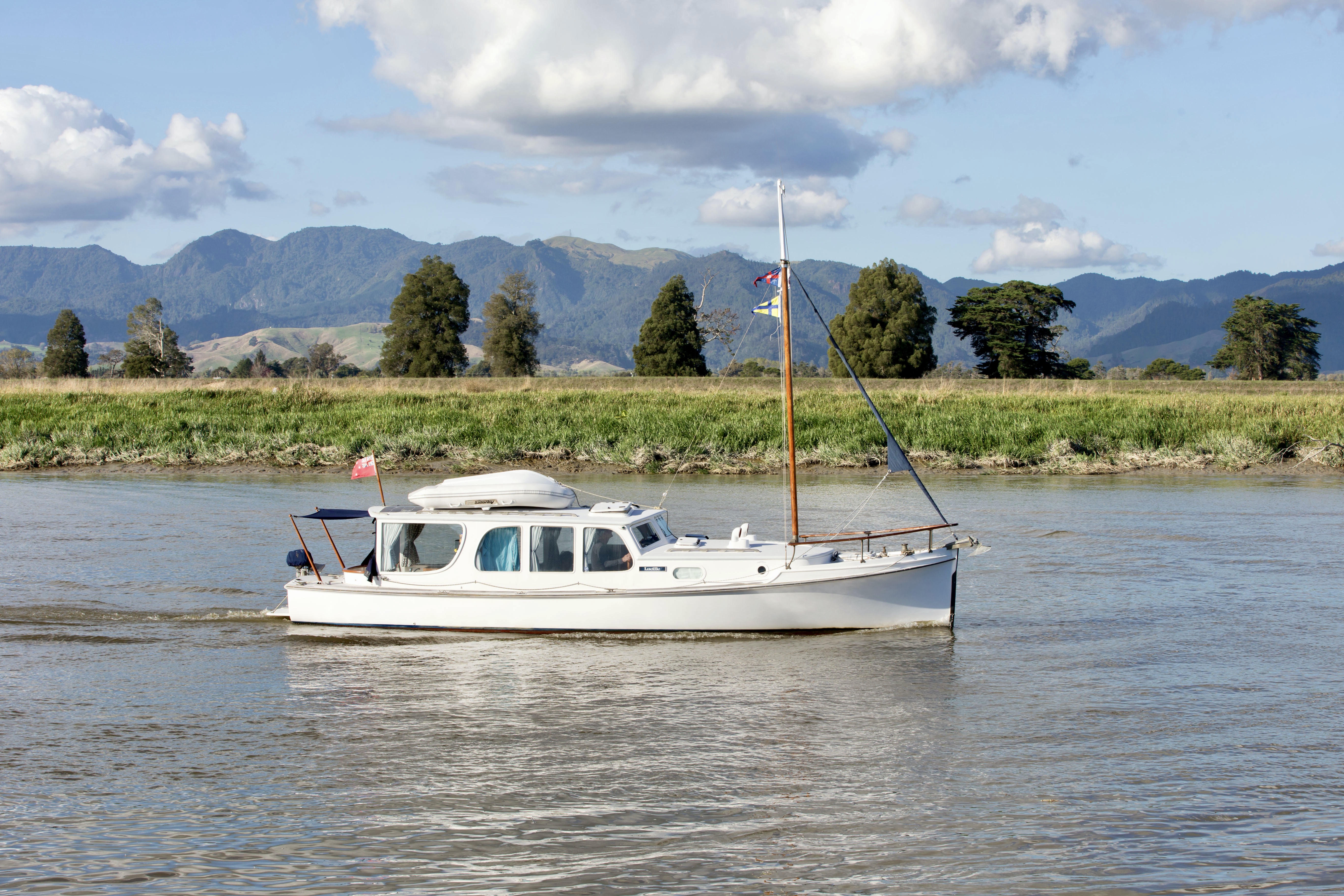 NGARUNUI was built in 1955 by Jim Young and started life, with a 1942 GM Detroit Marine Diesel engine (ex-war assets). It has now been fitted with a late model 200hp DOOSAN Diesel and has a Yanmar 20hp diesel auxiliary engine, with the prop for that engine mounted immediately above the main propeller.