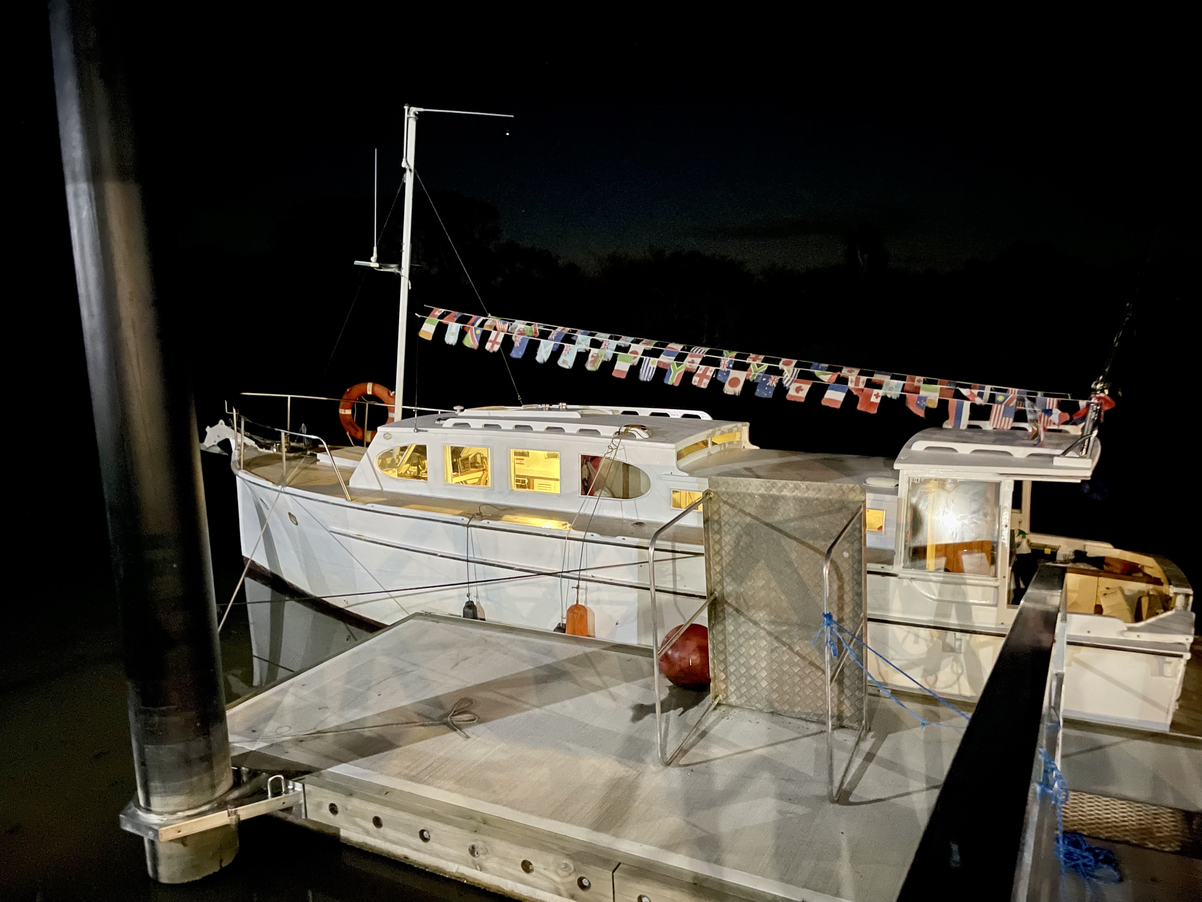 I replaced them almost immediately with two OM321 100 HP Mercedes Benz 6-cylinder diesels. I sold her six years later, when I started building my 40-foot Vindex, TIARRI, and a later owner replaced FLYING SCUD’s Mercedes Benz engines with two Bedford diesels.