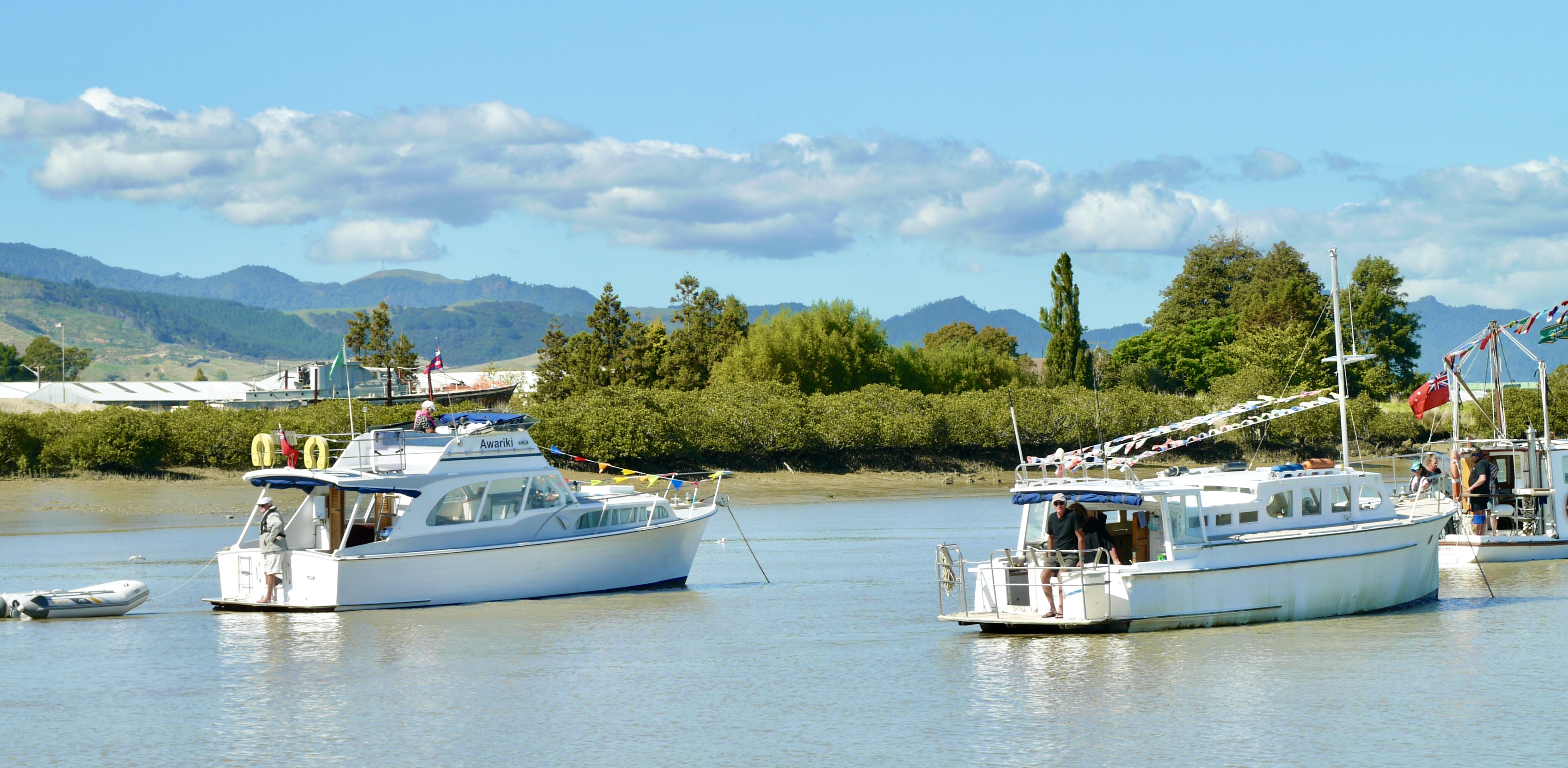 KAIKOURA WIH HER TWIN PERKINS V8 MARINE DIESELS IN BON ACCORD HARBOUR, KAWAU ISLAND c1984