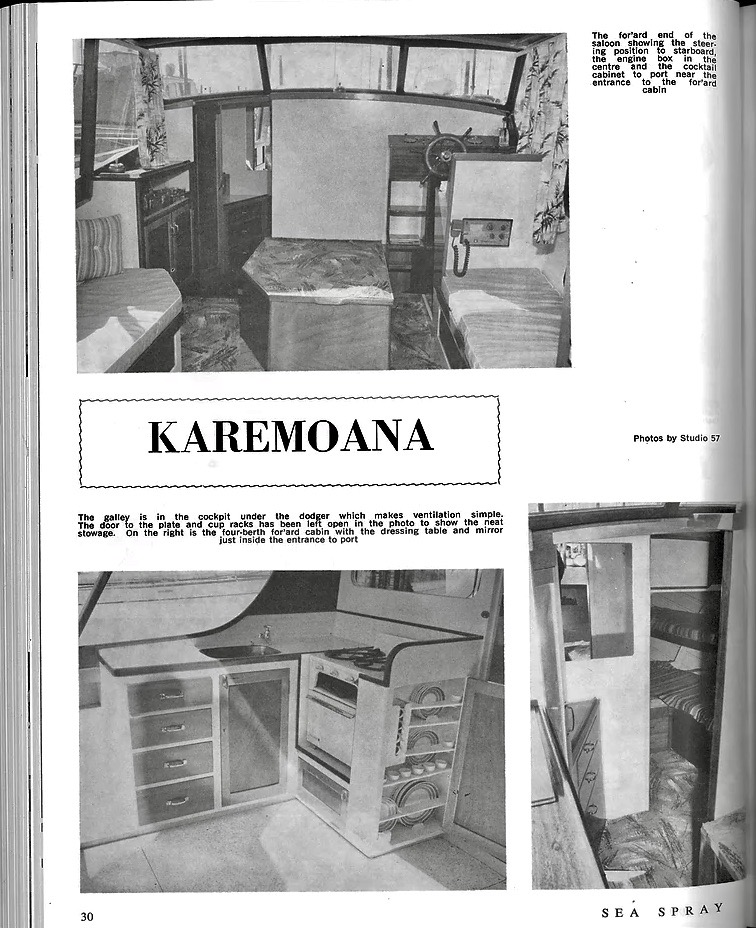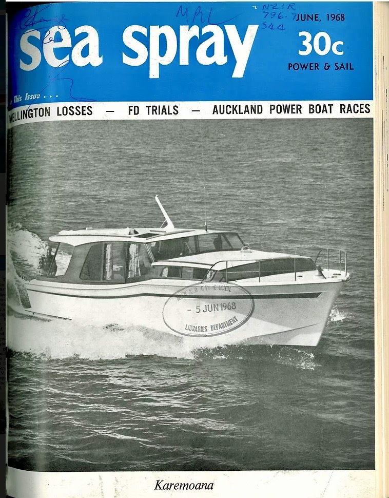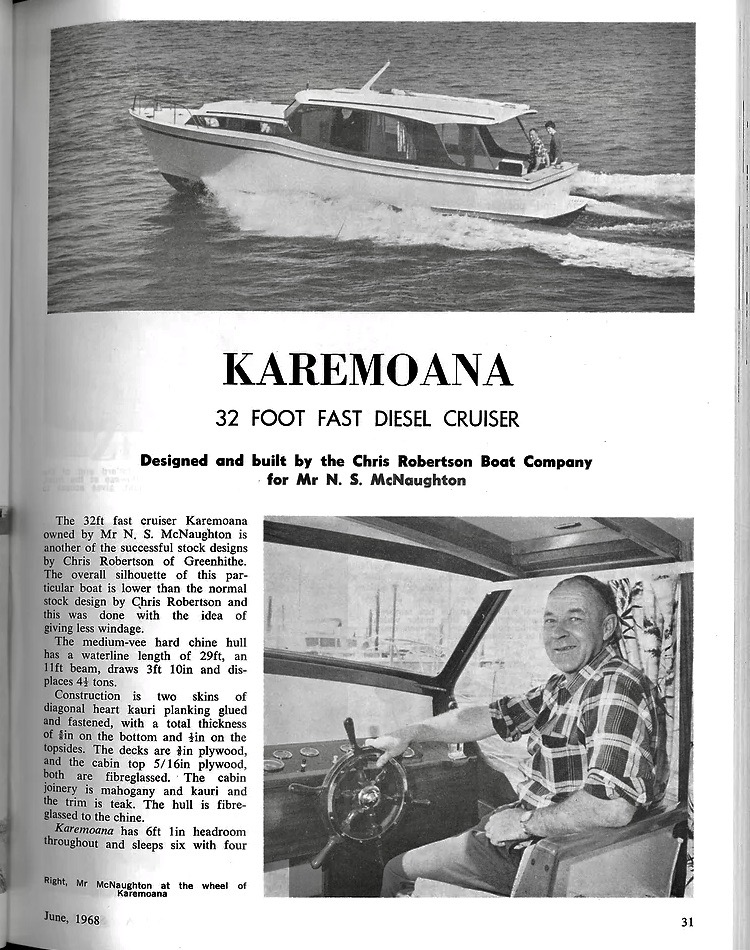 Todays woody is the classic wooden launch – KAREMOANA, designed and built by Chris Robertson and launched in 1968. She was one several craft referred to as the ‘ Chris Robertson Fast Cruisers’. And fast she was in her day, a 135hp Commer 3D215 diesel engine saw her topping out at 17 knots.
