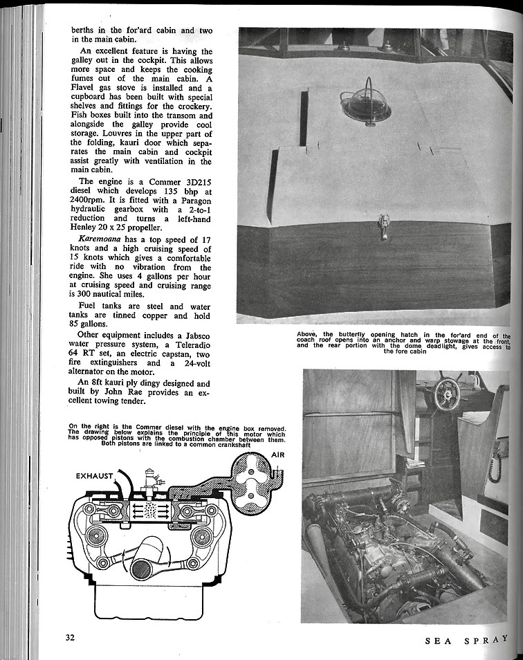 Construction was twin skin diagonal heart kauri planks. Her specs were 32’ x 11’ beam x 3’10” draft.