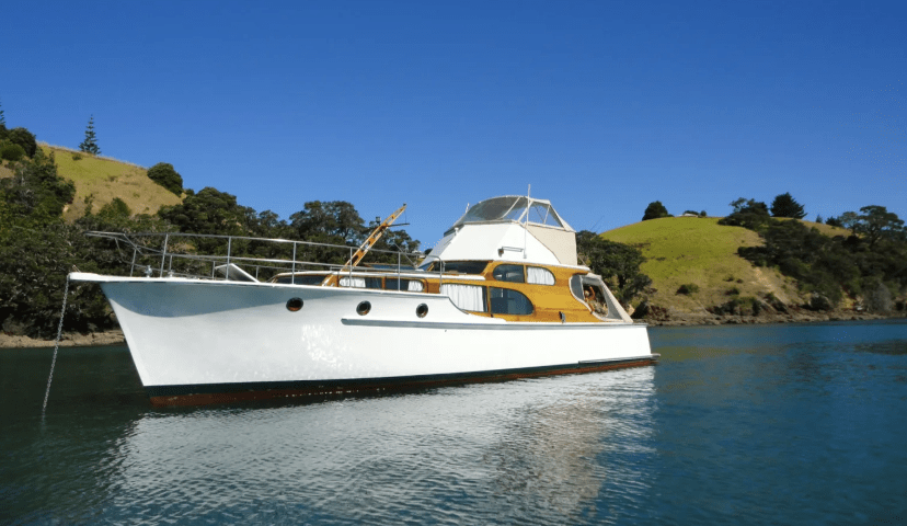 Designed by Parsons & built in 1959 in Tauranga. Carvel planked hull, powered by twin 120hp Fords. LOA 38’6″ x B 11′ 6″ x D 3′ 6″.