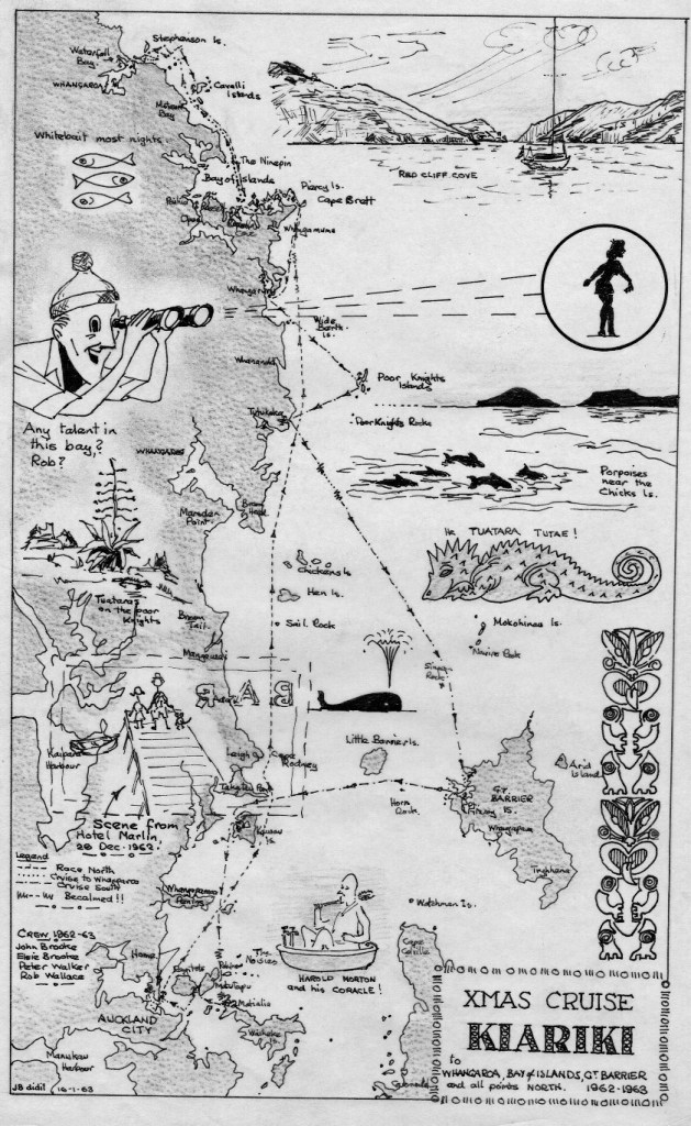The yacht Kiariki was designed by owner Jack (John) Brooke and built by John / Jack Logan / John Salthouse and launched in 1959. Using the best kauri, her specs are 40’ x 8’9” x 6’. During the Brooke family ownership period she was always one of the top 3 yachts in the K Class fleet. But to the Brooke family Kiariki was as much a family cruiser as a racer, and John Brooke had a wonderful ritual of recording every cruise in the form of a chart overlaid with caricatures of notable and amusing events – refer examples below.