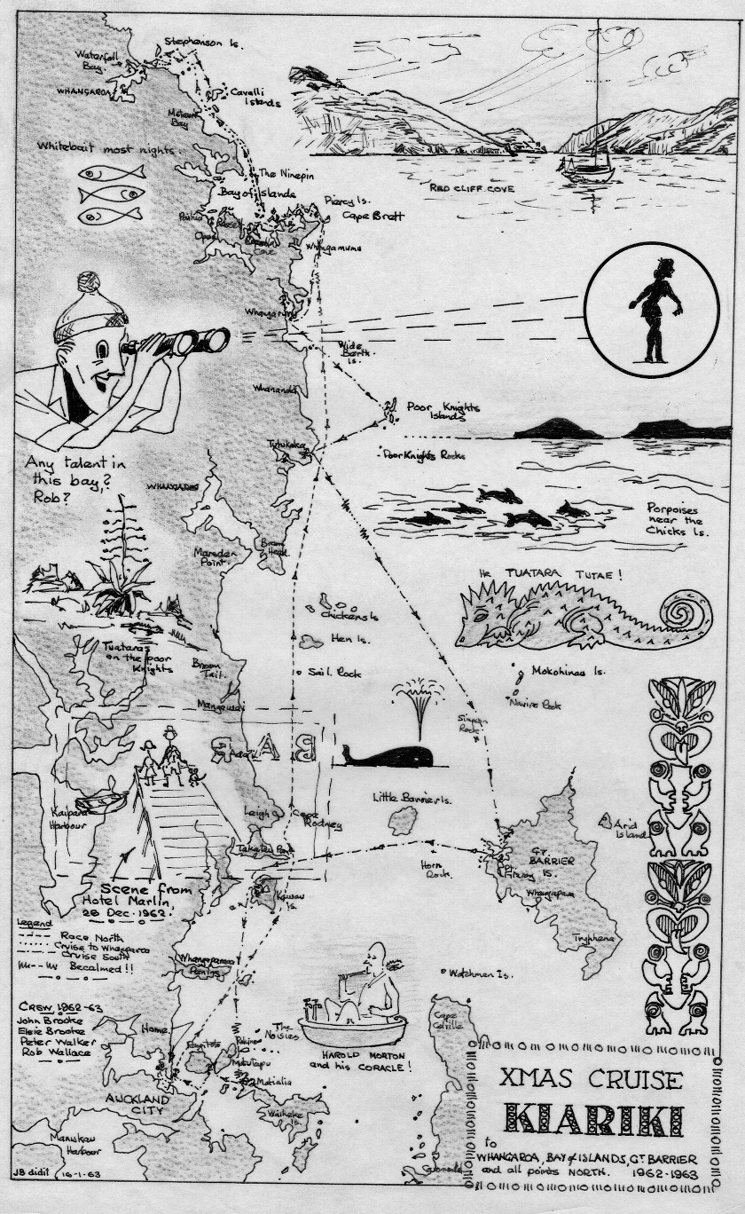 The above drawing records the travels of Kiariki during the Xmas 1961/62 cruise to Kawau Island, Kerikeri (Bay of Islands), Great Barrier all points in-between. Sounds like the weather gods did not smile for the trip north. If Robert or Judith are reading they might like to enlighten readers on the ‘birds & wasps’ reference.