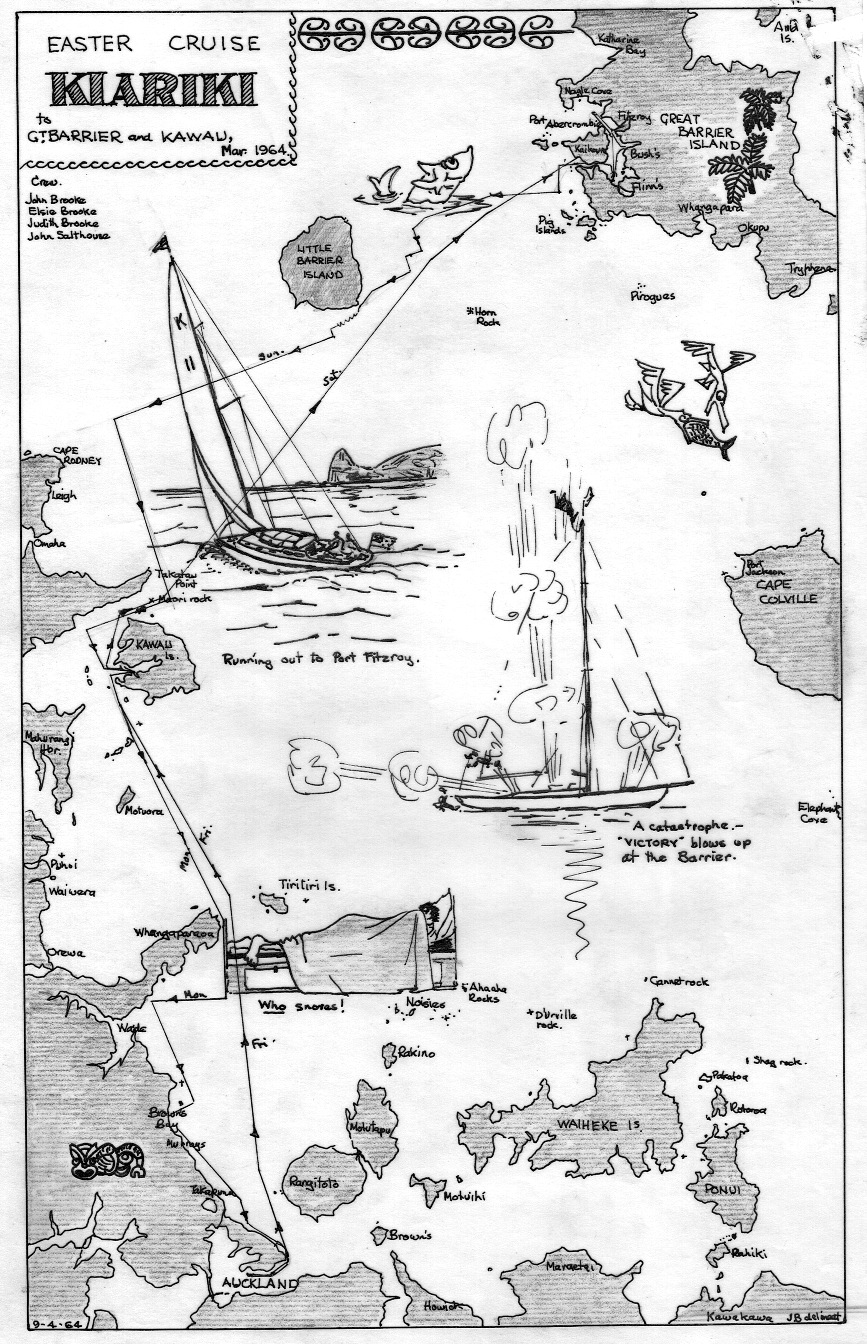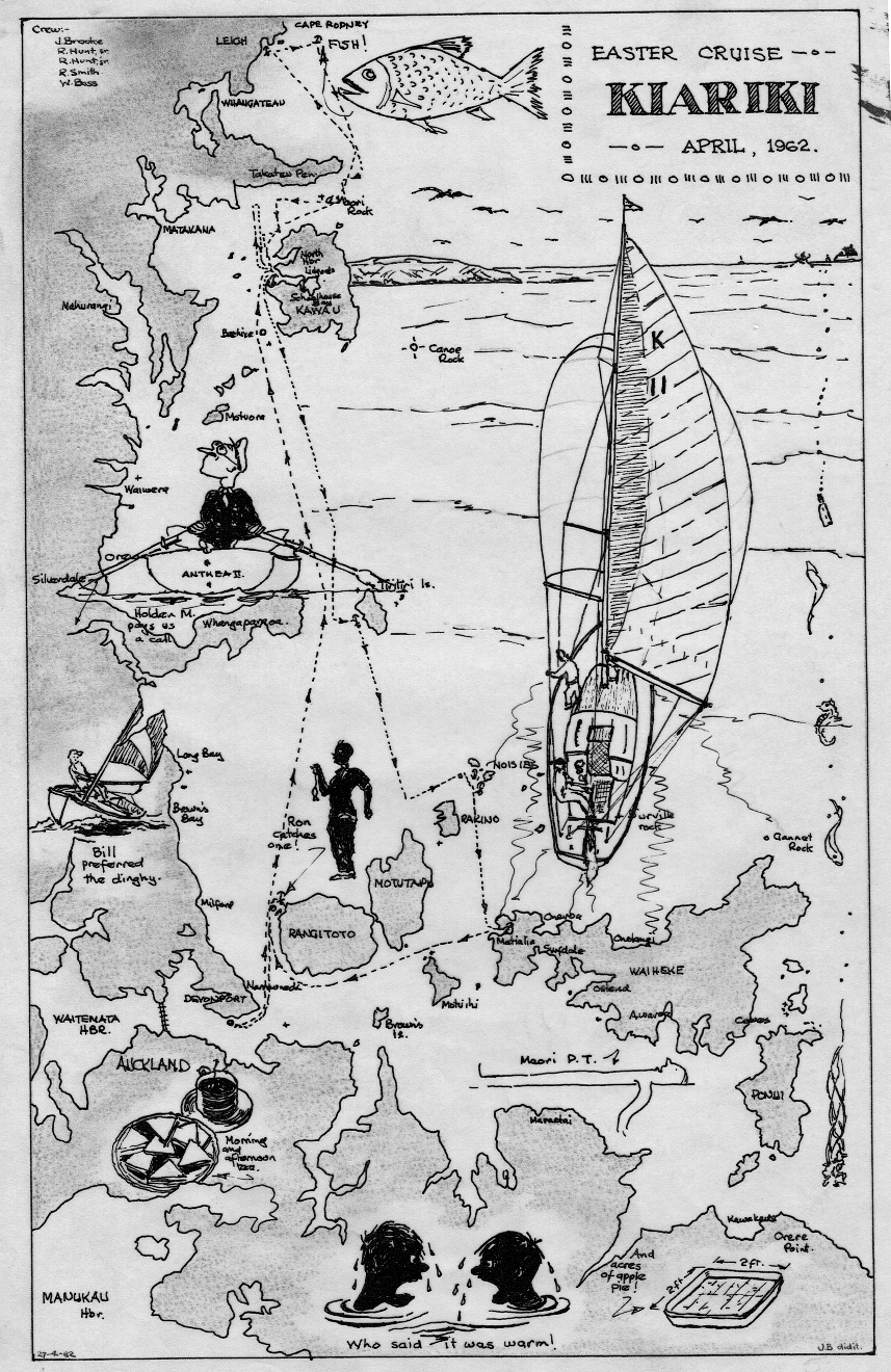 On the subject of the Brooke family and seeing its Easter I have reproduced below one of Jack Brooke’s drawing, recording the travels of their yacht Kiariki over Easter 1962, when they cruised to Kawau Island, Leigh and Waiheke Island and a few points in-between. Crew: John Brooke, R Hunt snr., R Hunt jnr., R Smith & W Bass.