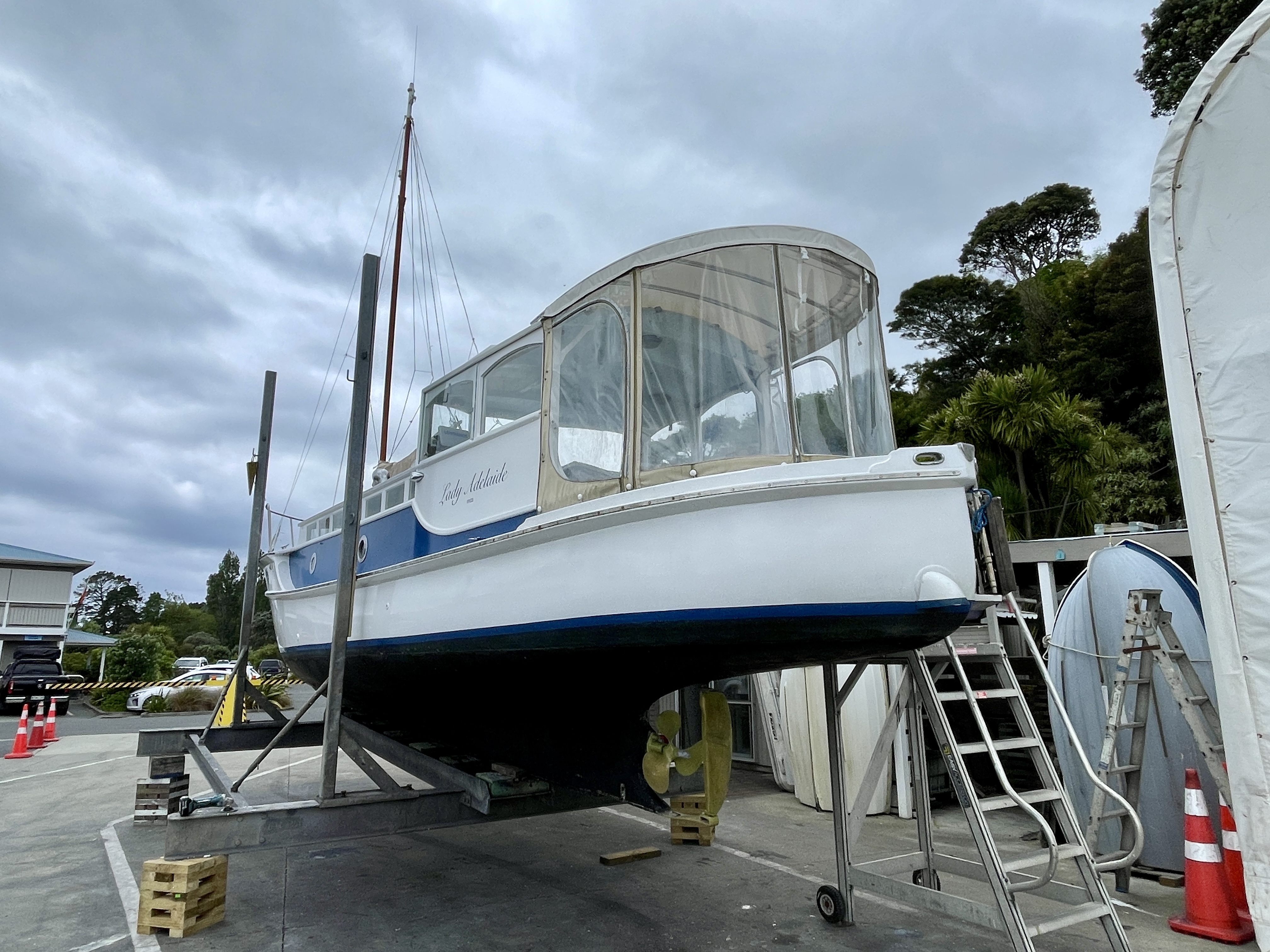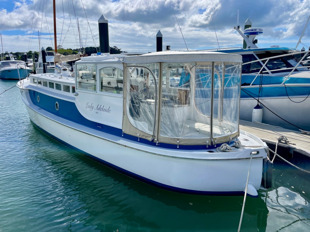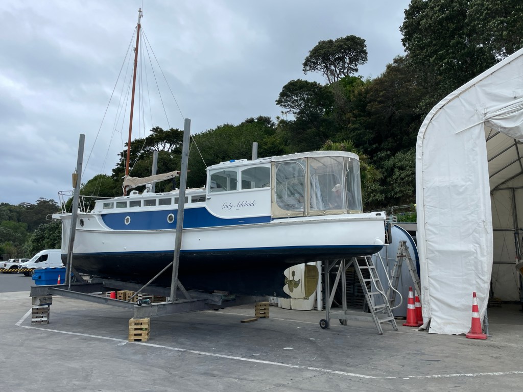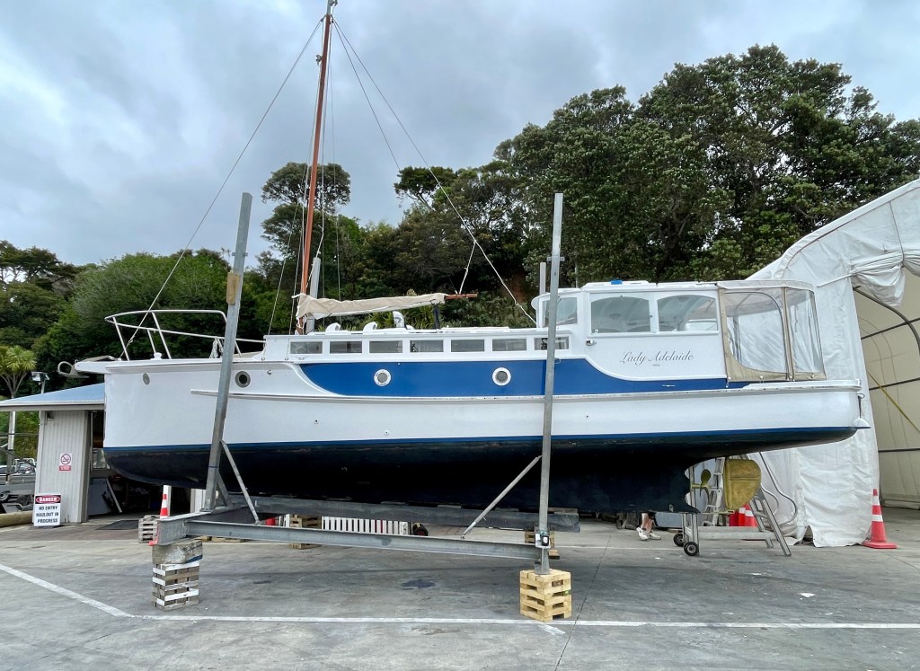 Lastly we have the 36’ , 1922, Dick Lang built launch – LADY ADELAIDE looking like she is about to be hauled out. https://waitematawoodys.com/2021/11/22/lady-adelaide-a-peek-down-below/