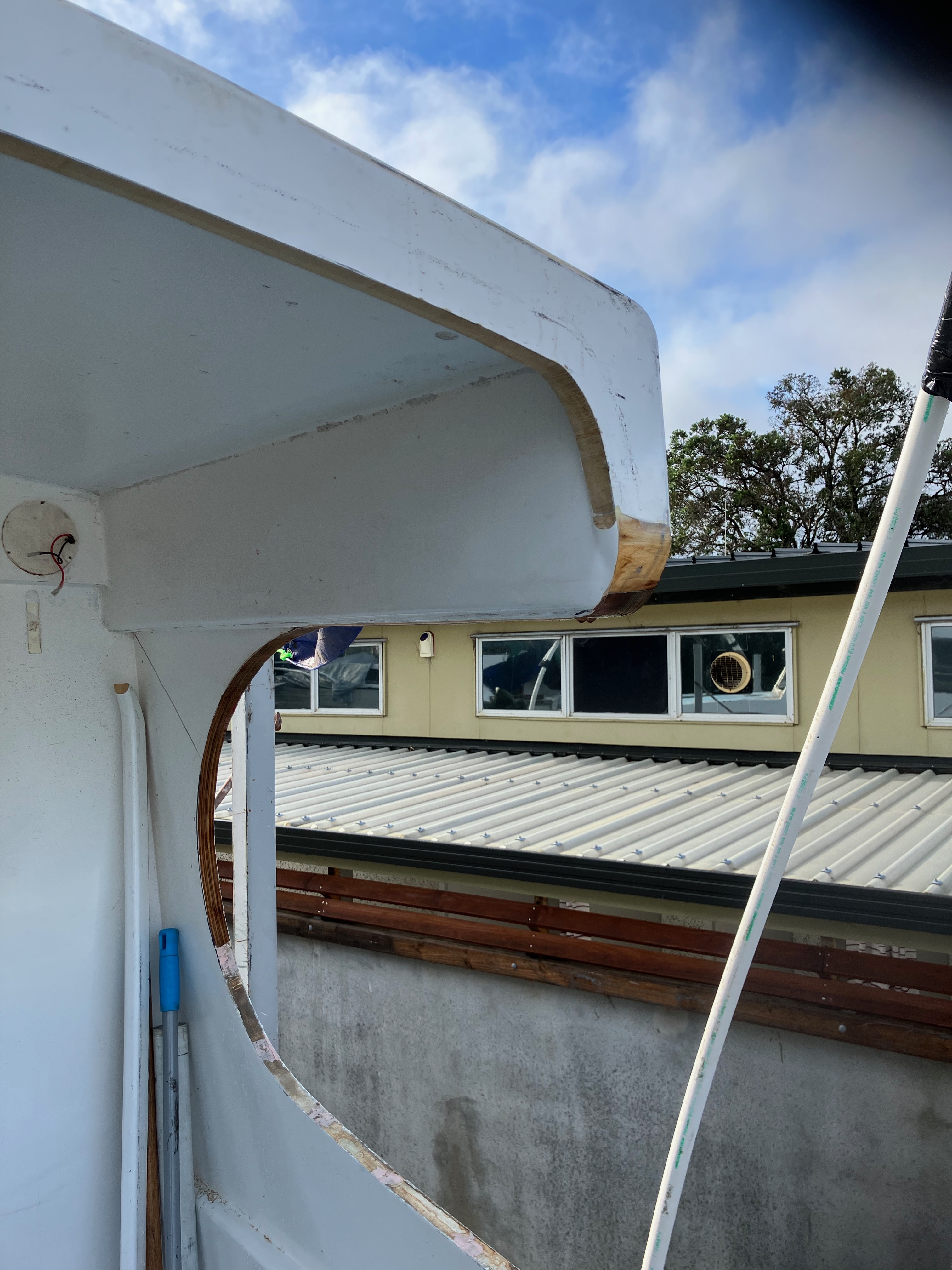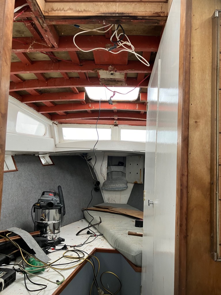 The ceiling in the forward cabin had to come down to sort a hatch that had been put in the wrong place. When the boat was reconfigured a past owner put a hatch in the centre of the forward cabin (to let light in I think) and then covered over the forward hatch. They then moved the mast to the top instead of the centre of the forward hardtop. So, in order to correct this back, we had to remove the ceiling as one of the ribs had been cut to allow for the hatch and this was compromising the integrity of the roof. The new ceiling will have insulation and show the ribs to give a little more height.