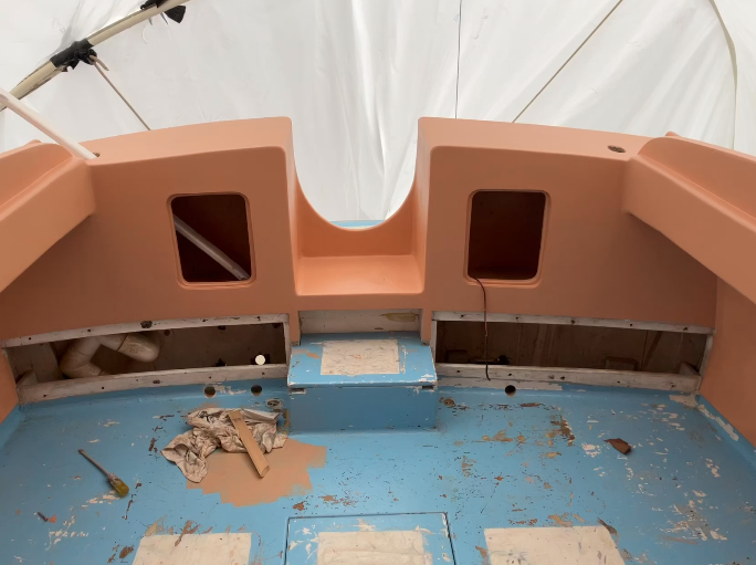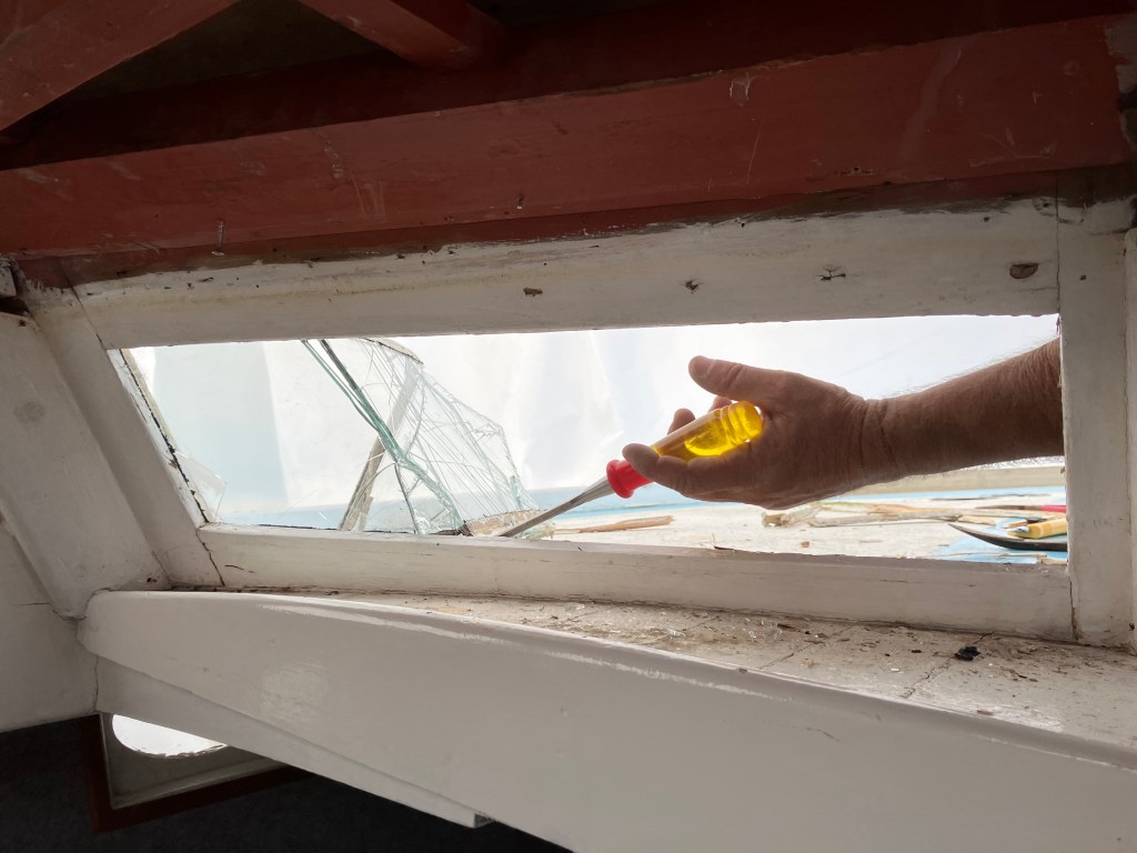 Now she is tented, we can remove things like steel/glass hatches (wooden ones need to go back) and the windows, which was done yesterday.