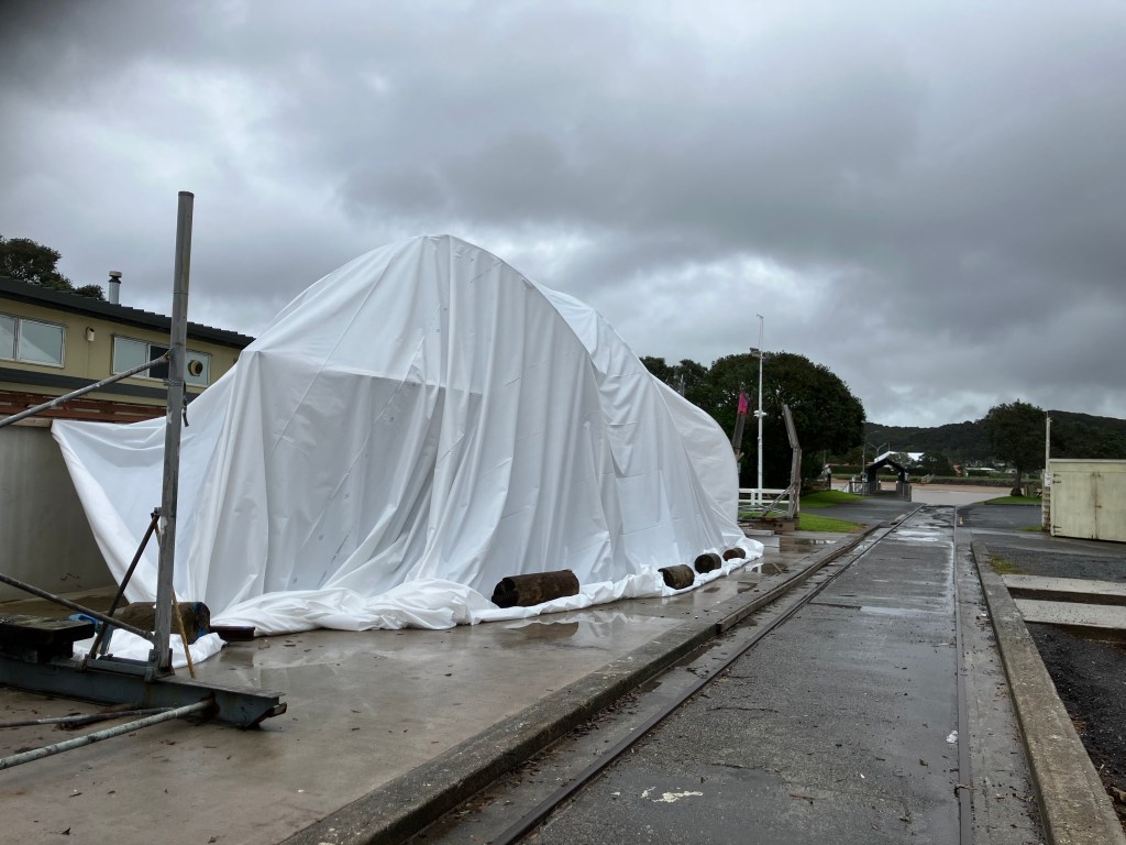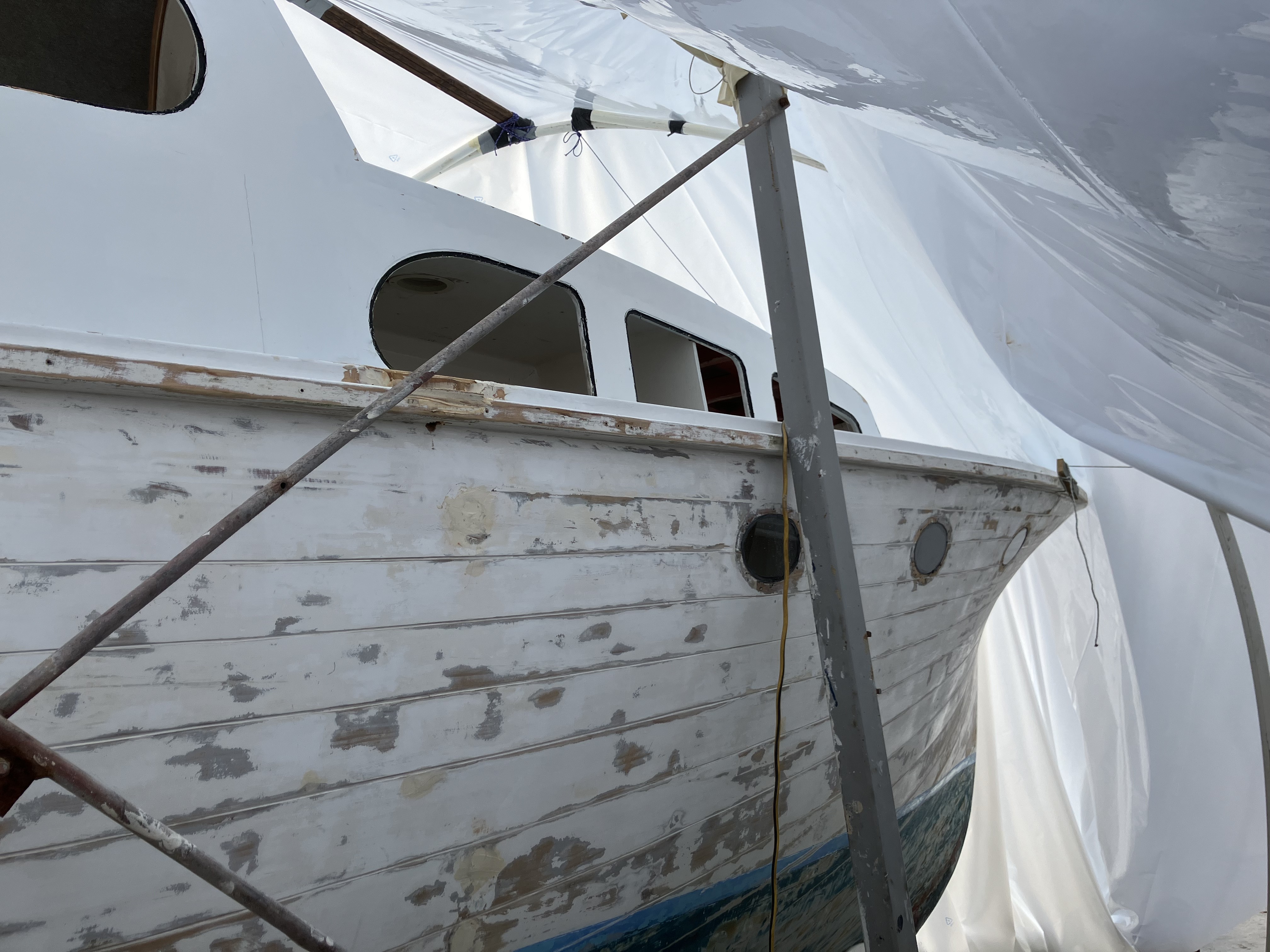 We are working through the Winter and have a limited time frame at the yard. The slipway closes during the Summer season because of the cruise ship passengers, which tender to the wharf there. So, we ordered a large – very large – piece of plastic, the type of which is used for tunnel houses, to cover the boat and then we waited on a certain freight company who shall remain nameless, and we waited….