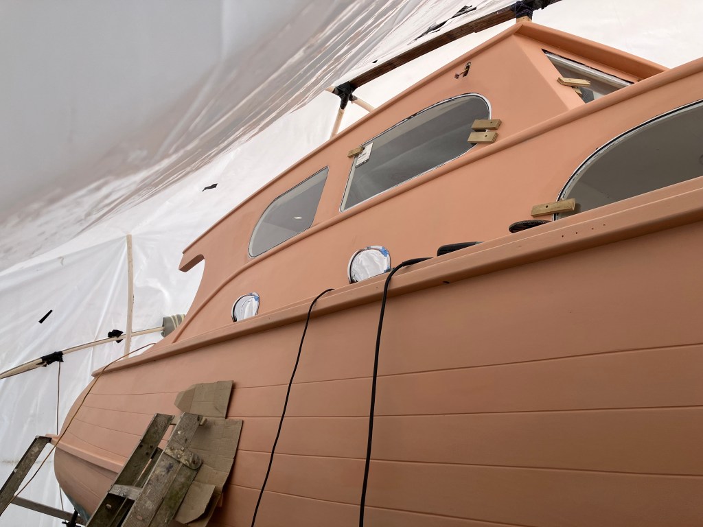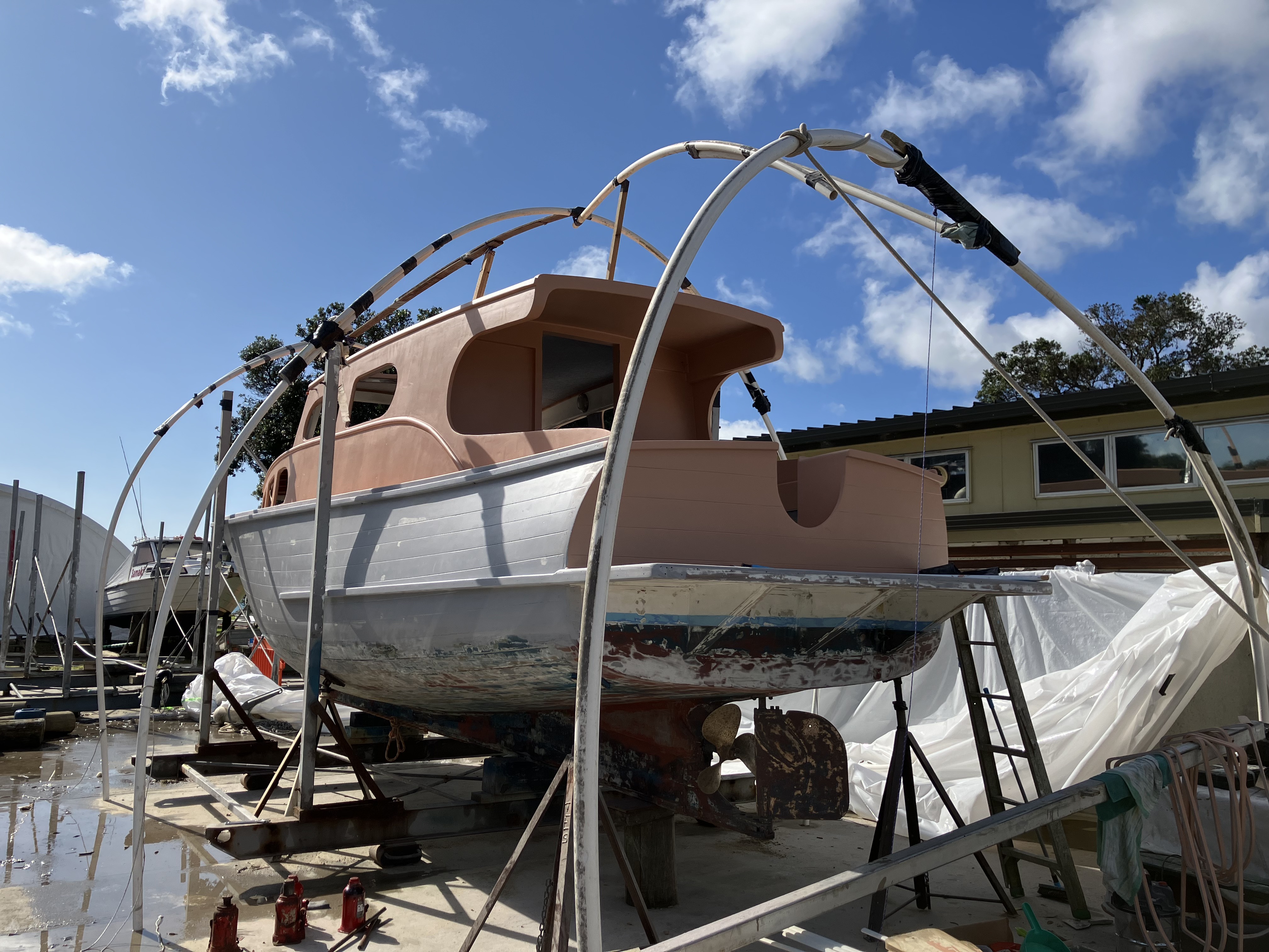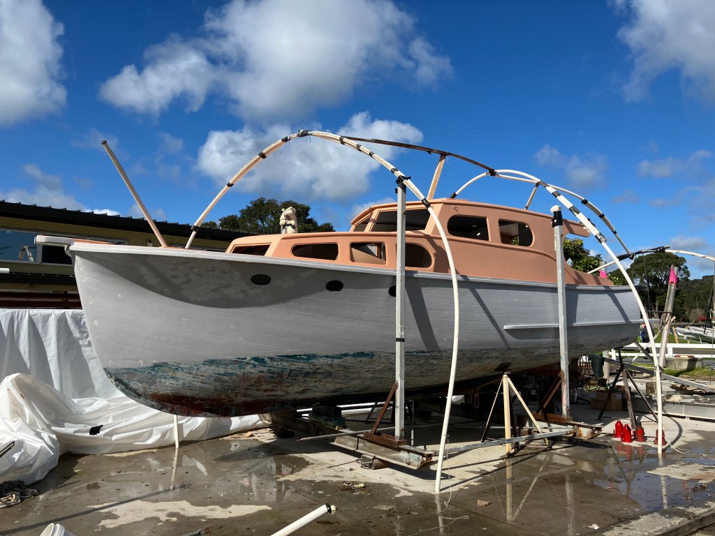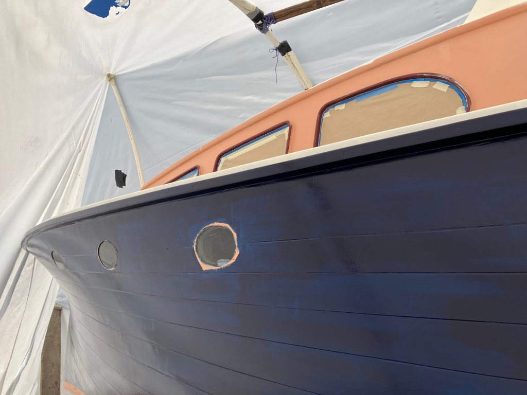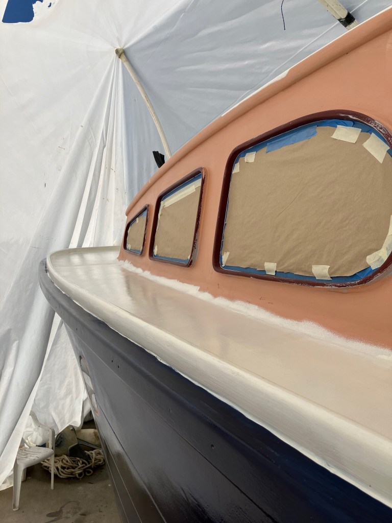 Sam, the Wynn Fraser rep has been helping with the colour scheme, which was posted previously. The inspiration behind the colour scheme is the reddy brown she had in the 70’s on the side section, with the added addition of a deep blue hull with white pinstripes to break up the blue and make her lines pop even more. It’s crucial that the blue works well with the reddy brown and that the white is not a bright white, more subdued almost like a mellow antique white. The finish will be low sheen, not gloss as I think that belongs to the modern boats with their perfectly finished hulls. The low sheen will give her more forgiveness. The whole boat is getting a flexible two pot system for strength and durability. Sam supplied the paint cards and test pots shown below to make sure they work on the boat and in the outdoor light. The test pots were glossy, so the finished look will be more subdued than the photograph.