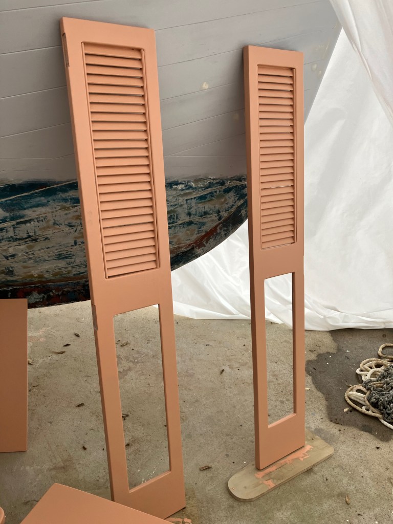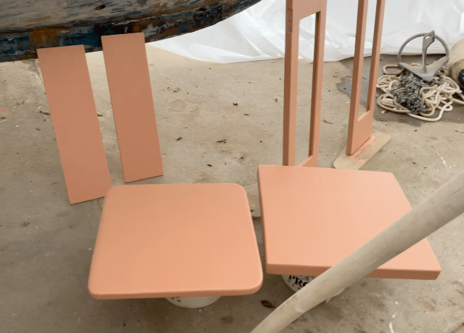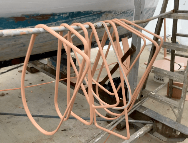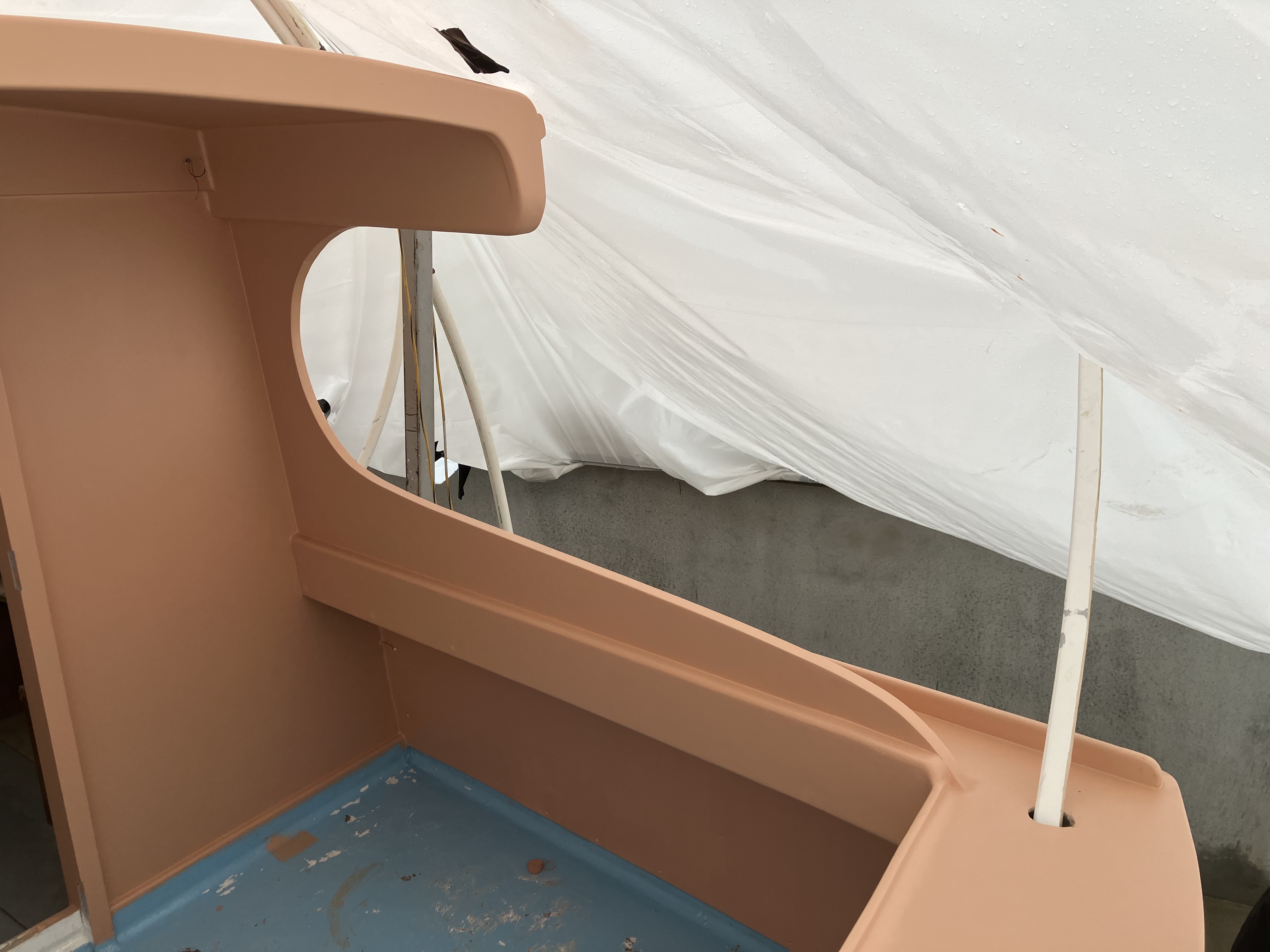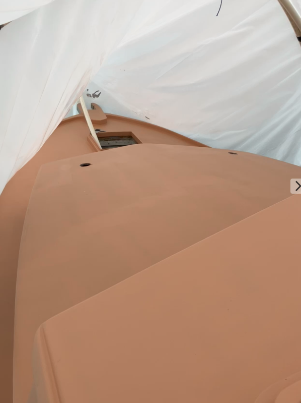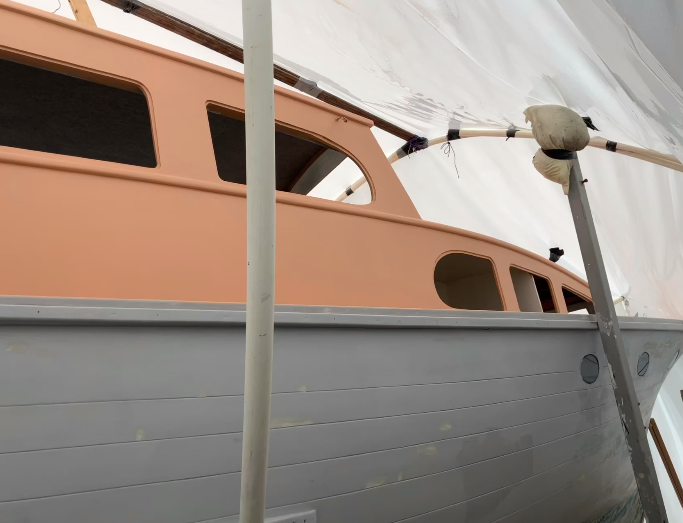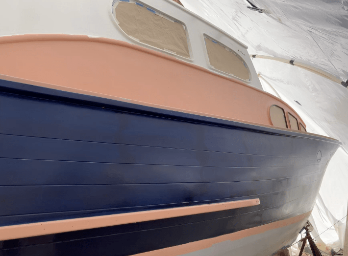 Sam, the Wynn Fraser rep has been helping with the colour scheme, which was posted previously. The inspiration behind the colour scheme is the reddy brown she had in the 70’s on the side section, with the added addition of a deep blue hull with white pinstripes to break up the blue and make her lines pop even more. It’s crucial that the blue works well with the reddy brown and that the white is not a bright white, more subdued almost like a mellow antique white. The finish will be low sheen, not gloss as I think that belongs to the modern boats with their perfectly finished hulls. The low sheen will give her more forgiveness. The whole boat is getting a flexible two pot system for strength and durability. Sam supplied the paint cards and test pots shown below to make sure they work on the boat and in the outdoor light. The test pots were glossy, so the finished look will be more subdued than the photograph.