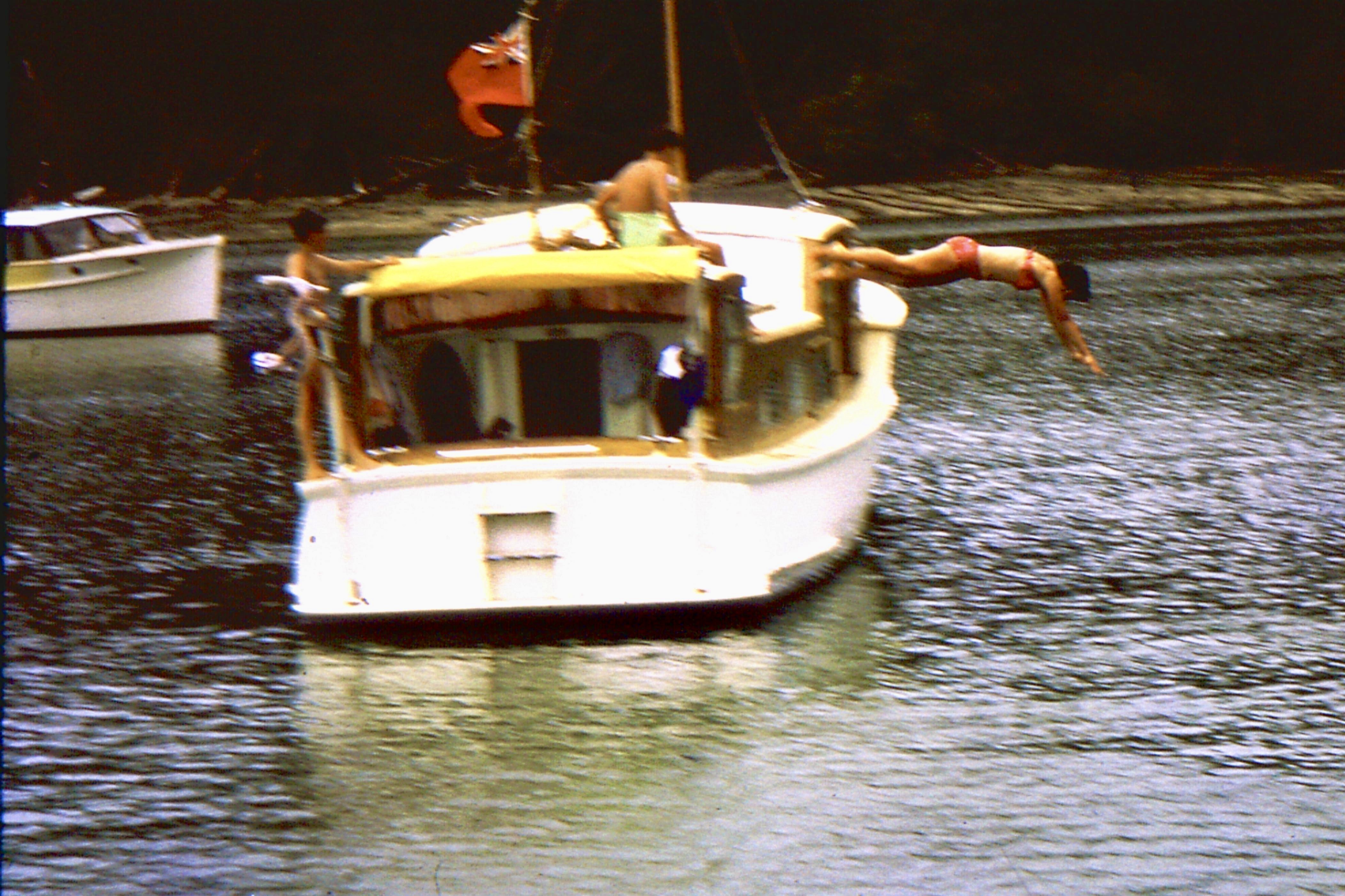 The other two photos are with Lady Joyce anchored with Len and Jean in the cockpit and third is taken at the same time with their daughter Dale Perry  diving off for a swim with Arthur Burke’s Yasawa in the background.
