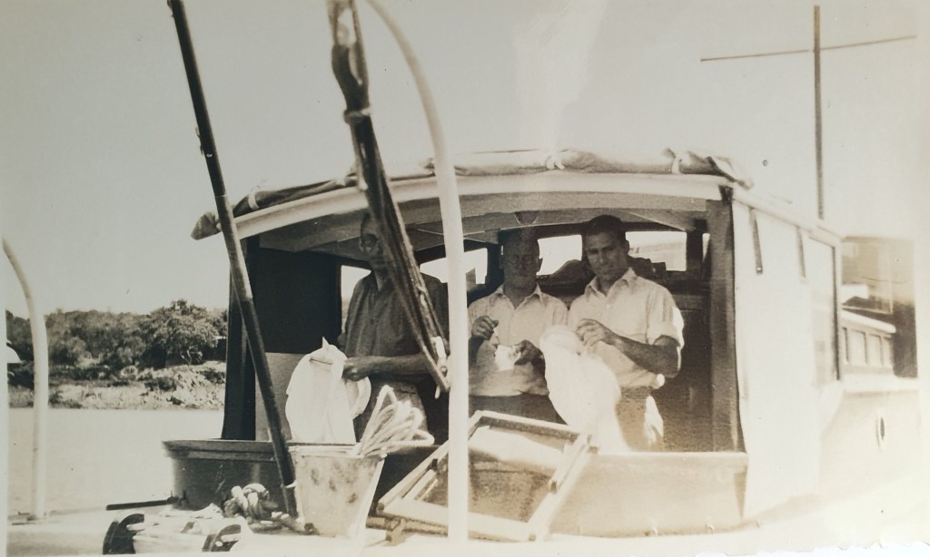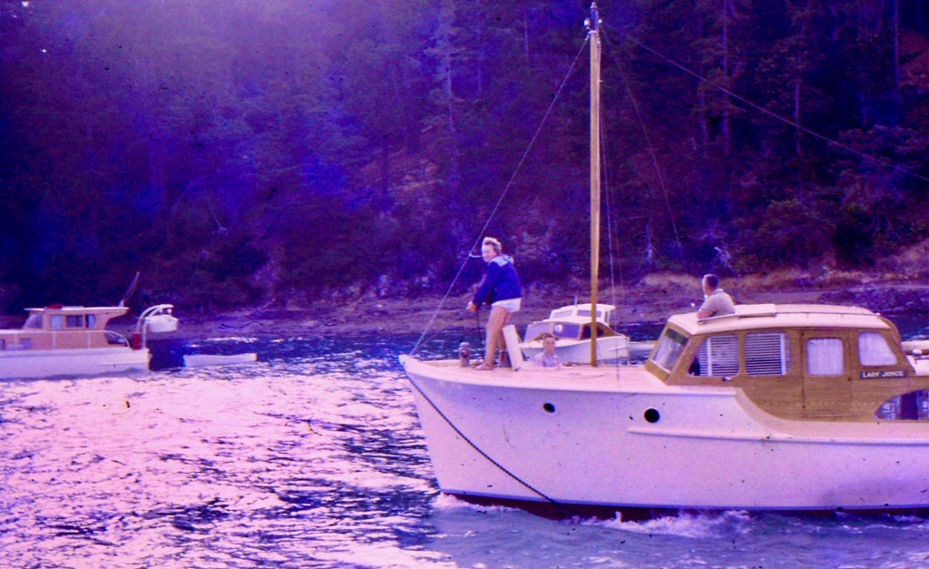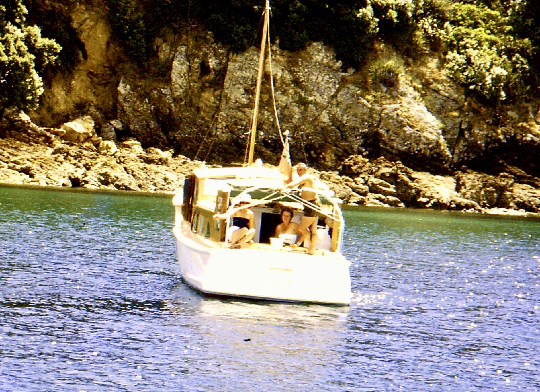 The first photo shows Jean struggling to haul the anchor in leaving Mansion House Bay while Len calmly powers off. A practice you still see today if anchored in a bay near Mark Edmond’s launch – Monterey 🙂