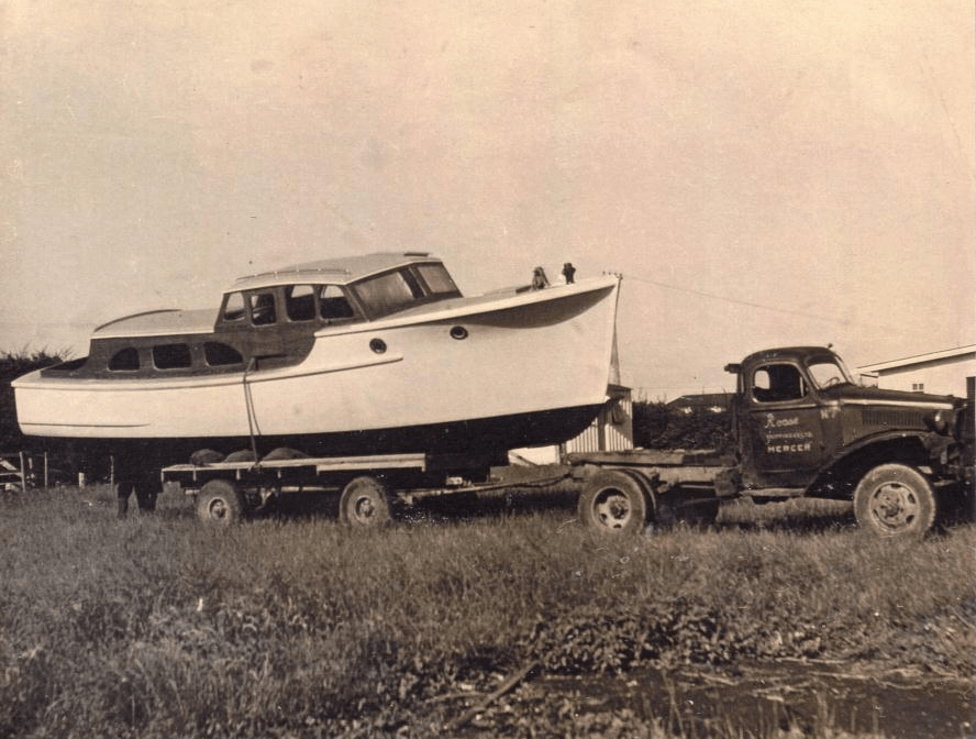 INPUT ex John Bullivant – boat is ‘Lady Joyce’, built by Willy Oliver on his farm at Pukekawa and launched in the Waikato in the late 40s. Pic is apparently around 1949. Truck belonged to Ceaser Roose (Roose Ind Mercer) and was apparently one of two  bought back from Pear Harbour. (info and photo from the Road Transport & Contracting archives Facebook page)