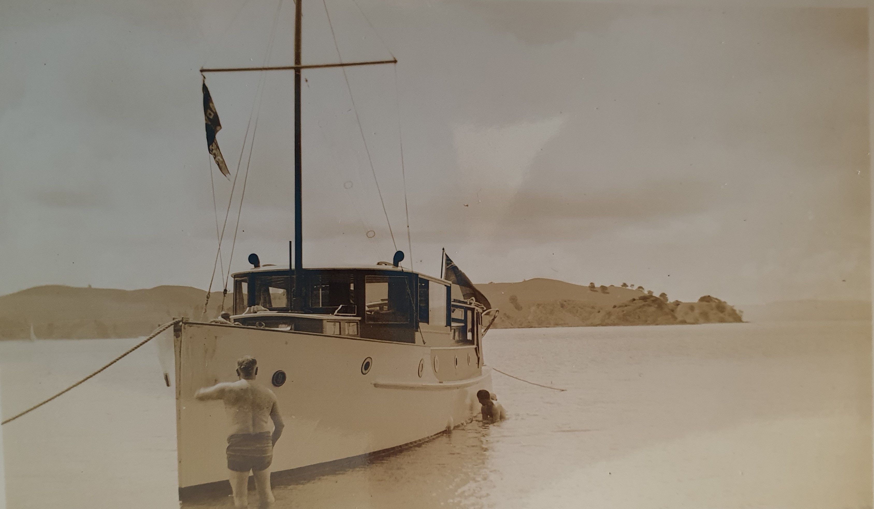 “I have followed with interest the various exchanges about the provenance of the launch the Lady Joyce. She was owned by my wife’s grandfather Shirley Harrowell for some years before and after WW2 and was named after his daughter Joyce.. Some time before the war my father, Reg Norris, with his friends Tom Jackson and Bill Harrowell ( Shirley’s son) holidayed on the Lady Joyce in the Bay of Islands.(The Jackson family had a house in Matauwhi Bay.) When my wife Nan’s nephews Paul Baragwanath and Mark Withers recently started taking an interest in the launch, which Mark mistakenly but understandably took for the Lady Shirley which he had seen at the Woodies Boat Show, I dug out some of dad’s old photos of the Lady Joyce to clarify the position. I thought that you would be interested in seeing the photos, which I attach. One of the photos shows Reg and Bill doing the dishes in the stern of Lady Joyce under the watchful eye of Shirley Harrowell.”