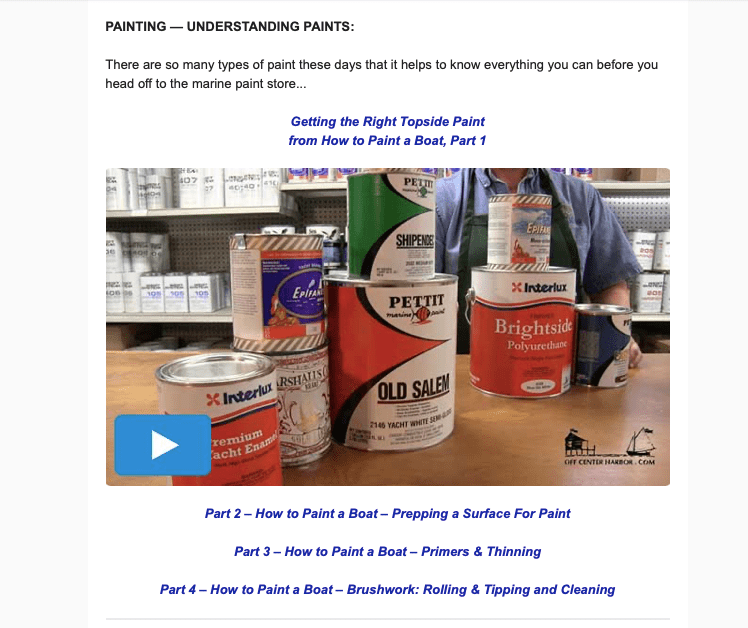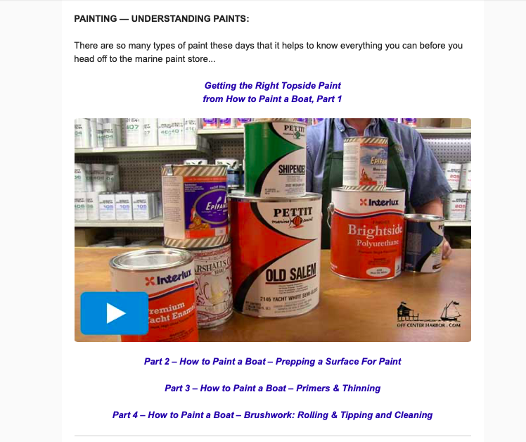 Regular WW readers will be familiar with the USA video blog Off Center Harbor. Over the weekend I received one of their regular newsletters – this one was all about maintenance on wooden boats – links to 40+ videos on painting, varnishing & epoxy use etc.   Because its a pay-2-view site I can not link you to it but the screen grab below will give you a peek at some of the cool content. Depending on the exchange rate – the annual sub is approx. NZ$80 – that woodys is minor compared to what you will save in time, materials and fixing oops. Subscription info here – https://www.offcenterharbor.com