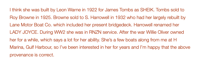 In a previous WW story HDK commented (refer below) that Lady Joyce was most likely built in 1922 by Leon Warne. When launched she was named Sheik.In c.1932 she was extensively rebuilt at the Lane Motor Boat.