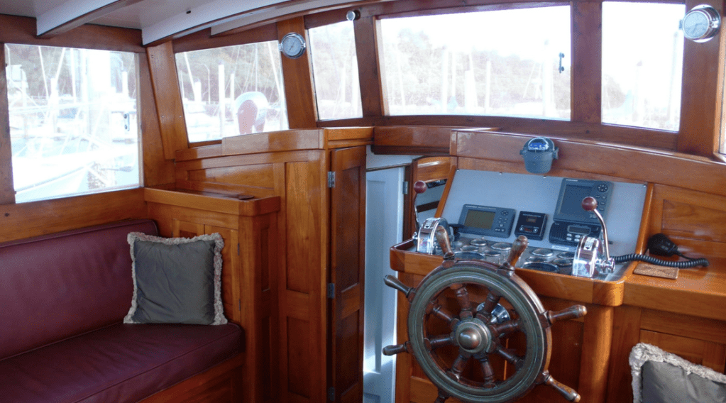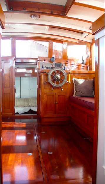 REHIA WTH HER c100HP BUDA FLAT HEAD 6 CYL. PETROL ENGINE, WHICH HAD DUAL IGNITION, WITH 12 SPARK PLUGS, FED FROM A SINGLE 12 POSITION DITSRIBUTOR CAP, & A BENDIX REVERSE CONTROL SYSTEM, & THROTTLE, WTH 2 LITTLE 6 INCH LEVERS, IN A DUAL SMALL CONTROL UNIT. – VERY RARE IN THOSE DAYS.THIS WAS HER ORIGINAL ENGINE FROM NEW, WHICH SHE HAD FOR A GREAT MANY YEARS, & OWNER, BILL RYAN, IS STANDING IN THE DOORWA.