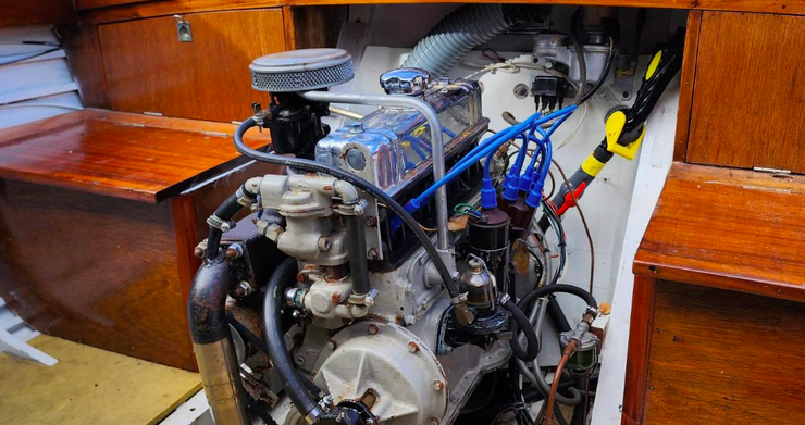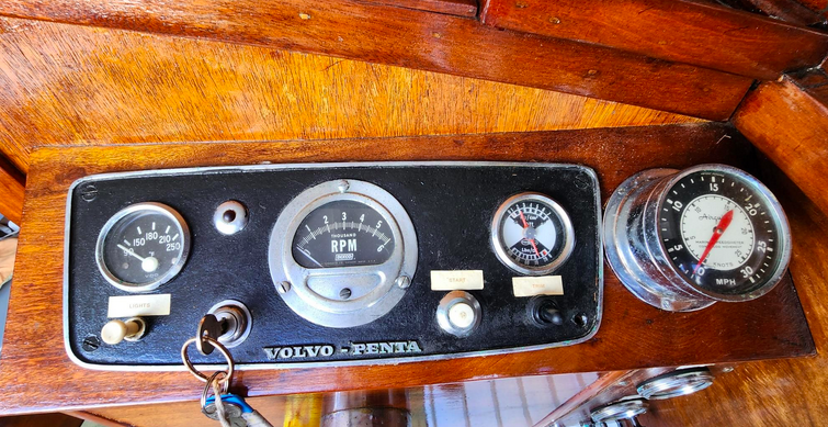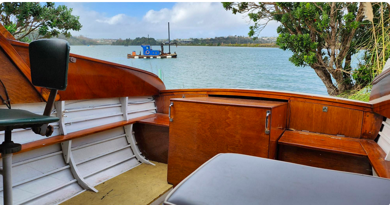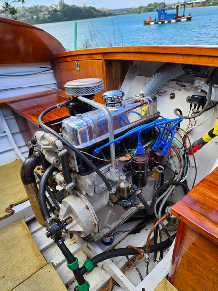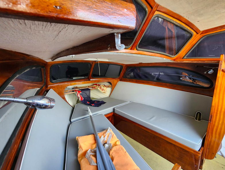 The story goes that there were two boats built to the same design – the first boat was (possibly) built to take the Queen Mother fishing on Lake Taupo, in the early 1960s, and the second for old family friends of the current owner, they had a house at Rainbow Point, Taupo. The boat was fitted with a Volvo Penta Stern drive. The colour of the block (bronze) suggests it was either the first or second stern drive ever imported. When the house at Rainbow Point sold – the current owner bought the boat of the family. It had sat under cover for 60 years odd – she was as dry as a bone. Her new owner, a highly skilled furniture restorer commenced a restoration that included – engine reconditioned, new exhaust manifold, complete rewire, new upholstery, 1,000 hours on the woodwork and paintwork, new covers. An amazing project that accumulated with the craft winning ‘Best Presented Boat’ at Aucklands Outboard Boating Club (OBC). Power is from a 1962 Volvo 75hp stern drive (petrol)