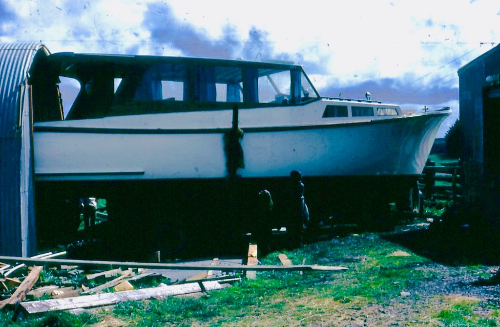 The dairy cows were sold that year, with beef cattle replacing them. So Keith was able to work full time on the boat after that. The motor went in (Ford 110 hp) and the work continued uninterrupted until it was completed by September 1974.