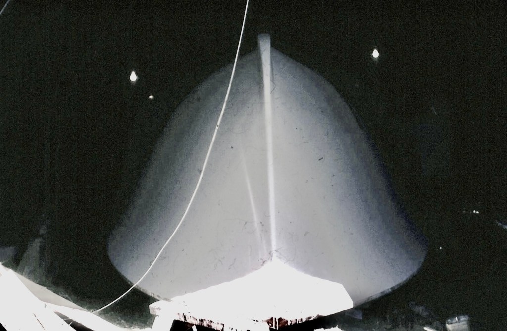 The question was where to build it? That was no problem….there was the round barn next to the cowshed. So it was cleaned out and the work began. The first job was to put the building frames in place, starting at the bow of the boat, and placed in order the full length of the boat. Once this was done, then the stringers went on, all screwed and glued into place. The four skins of the kauri went on, one by one, placed diagonally a different way each time. This was the most tedious job of the lot. For a whole twelve months, nothing was done after the first skin went on, until an older man took pity on him and came to give a hand now and then. After that was done, then the fibre-glassing was done….the first coat of resin was put on over fibre-glass cloth, sanded down, and then another coat of resin before the final coat of white fibre-glass paint.