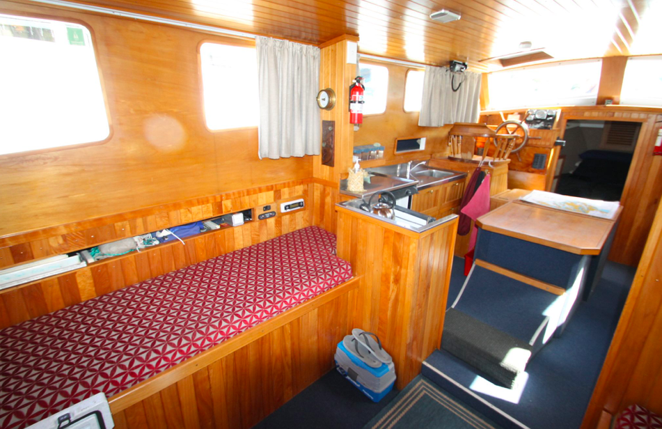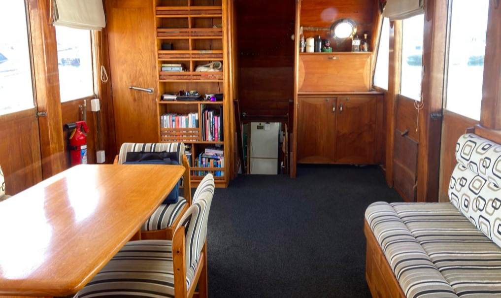 The insurance company sold her “as is, where is,” and someone bought her, chopped off the burnt-out back end, and fitted her, in her now shortened form, with two 6/71 GM Detroit diesels, added new pleasure craft-type coamings, and called her the LADY SOMETHING? or SOMETHING LADY?. This work was all done on the hardstand at Half Moon Bay Marina.