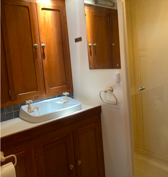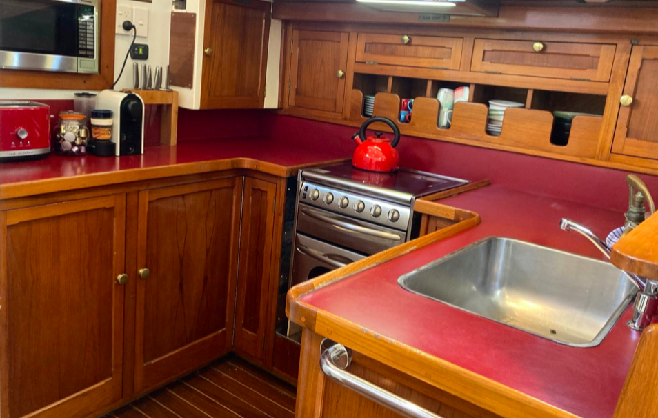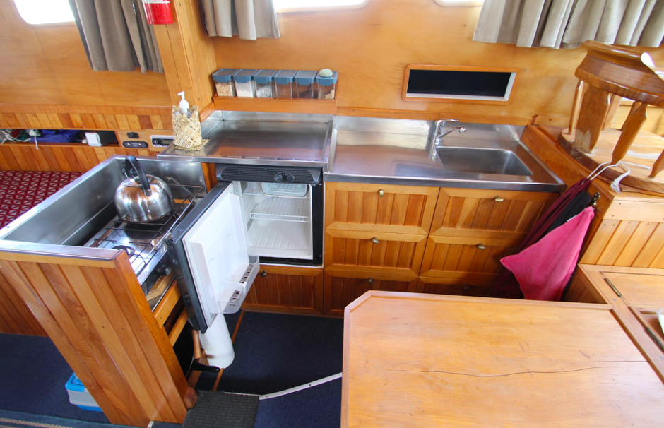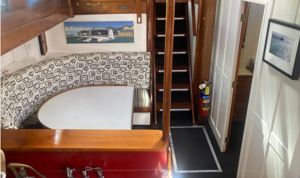 The Sterling was replaced in 1976 with a Lees Marine 6 cylinder Ford diesel. New stainless steel fuel tanks amidships replaced the old copper tanks under the aft deck which became the water tanks. The old Sterling engine went to scrap but we retained the name plates which were passed on to the new owner of TASMAN, Stephen Cashmore.