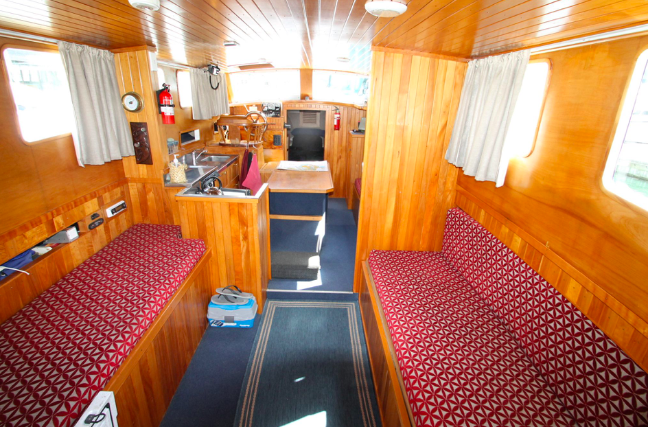 The insurance company sold her “as is, where is,” and someone bought her, chopped off the burnt-out back end, and fitted her, in her now shortened form, with two 6/71 GM Detroit diesels, added new pleasure craft-type coamings, and called her the LADY SOMETHING? or SOMETHING LADY?. This work was all done on the hardstand at Half Moon Bay Marina.