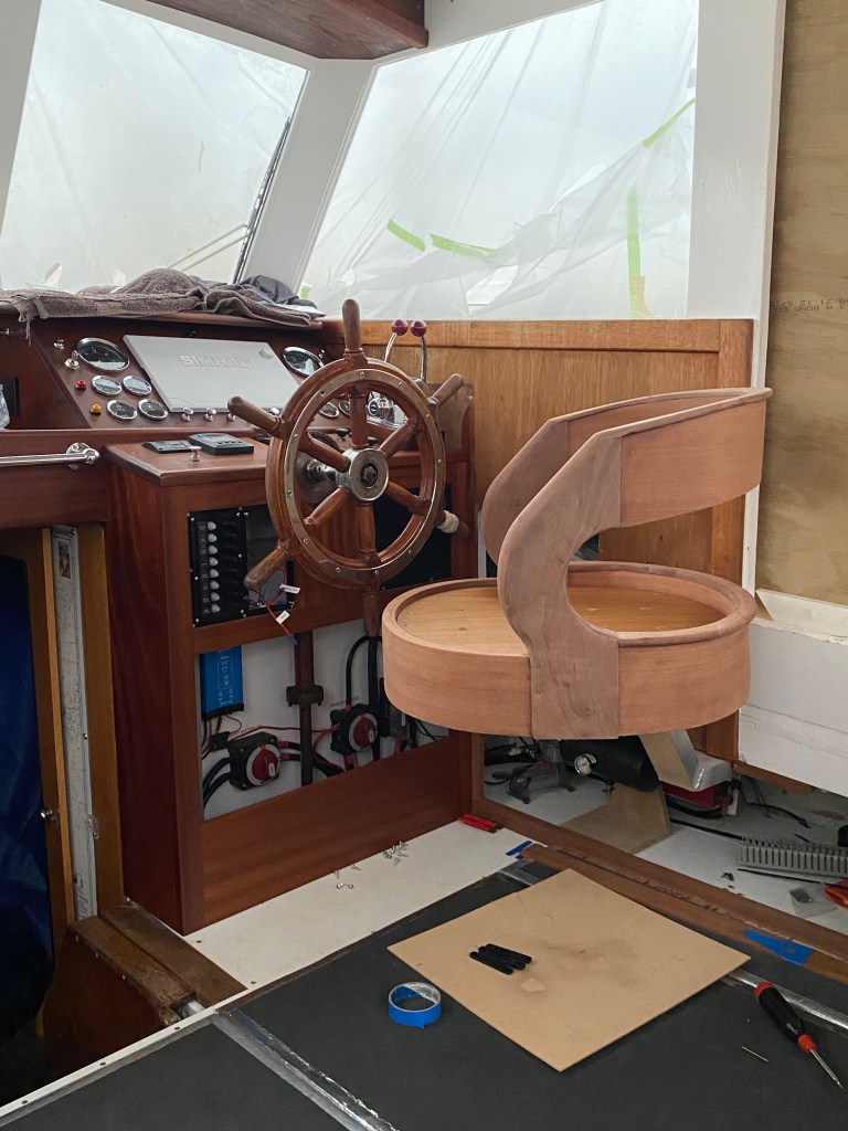 UPDATE 27-11-23 – Mark commented that another Xmas will slide by before the refit is completed – but the very talent man is making a very samrt helm seat – photos below