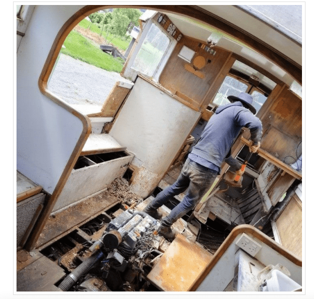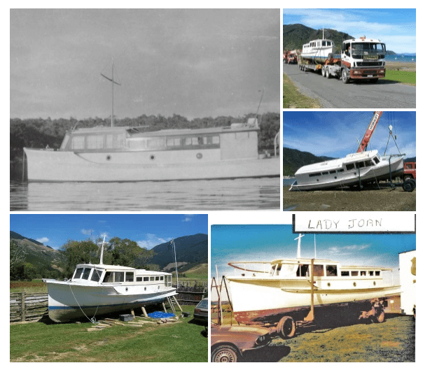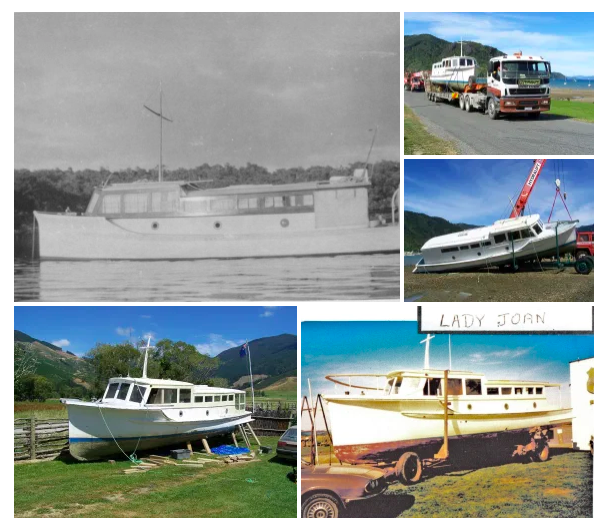 UPDATE: The launch is Lady Joan, thanks Ken R for the reminder. Sadly no longer a float she was scraped back in 2018 and a few fittings were saved, hopefully to grace another woody. Photos below LJ has appeared on WW before – see and read more here https://waitematawoodys.com/2013/09/29/lady-joan/