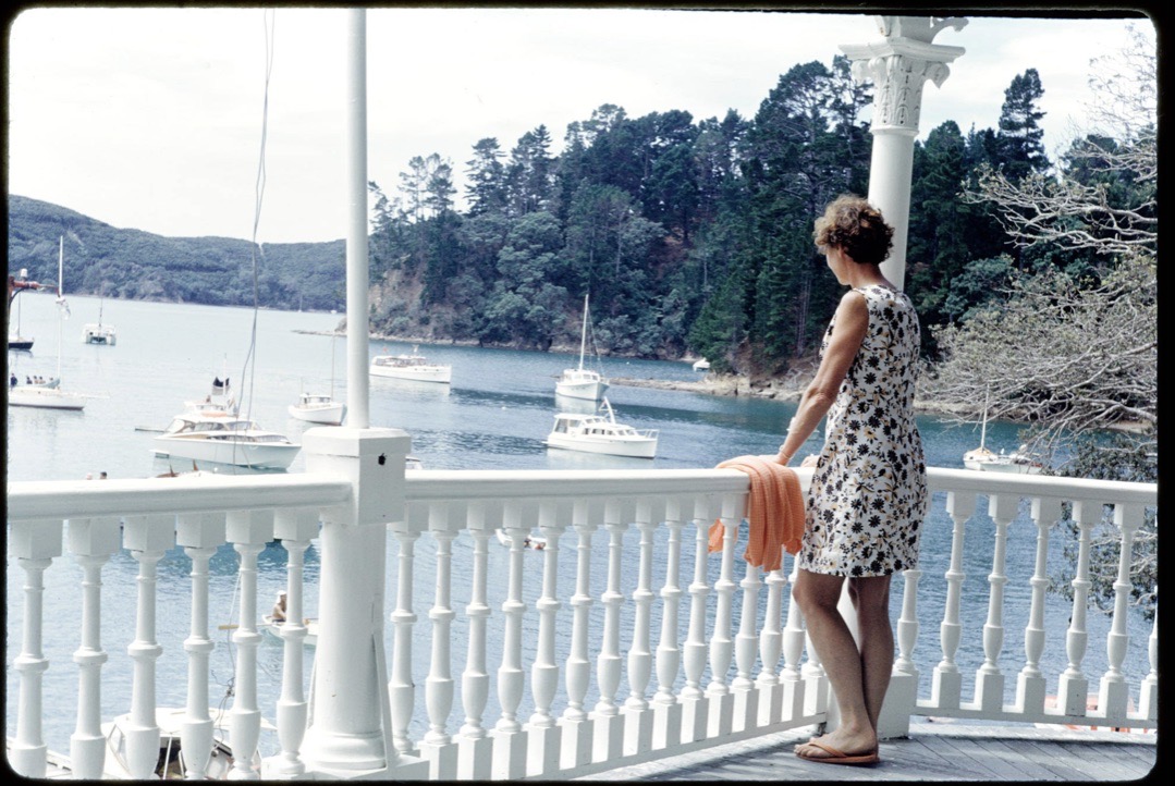 The caption reads ‘Muriel Clark on the balcony at Mansion House, KAWAU ISLAND. 1971, Ron Clark (the photographer I assume).