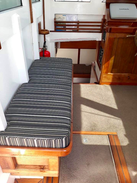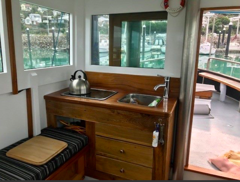 MANURERE’s hull, engine and ancillary equipment are in very good condition. The interior was recently restored, ‘in keeping’ using native timbers. Powered by a Iveco 120hp marine diesel, she uses about a litre of diesel per nautical mile at 8 knots. Recently work included the injectors being tuned, new water pump and starter motor and a powered second alternator fitted, upgraded bilge pump and system. Modern electronics fitted including AIS. , 230V power with power points throughout. Smart charger charges the 3 battery banks simultaneously.