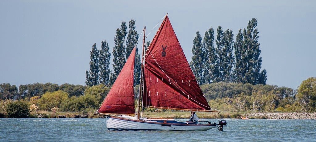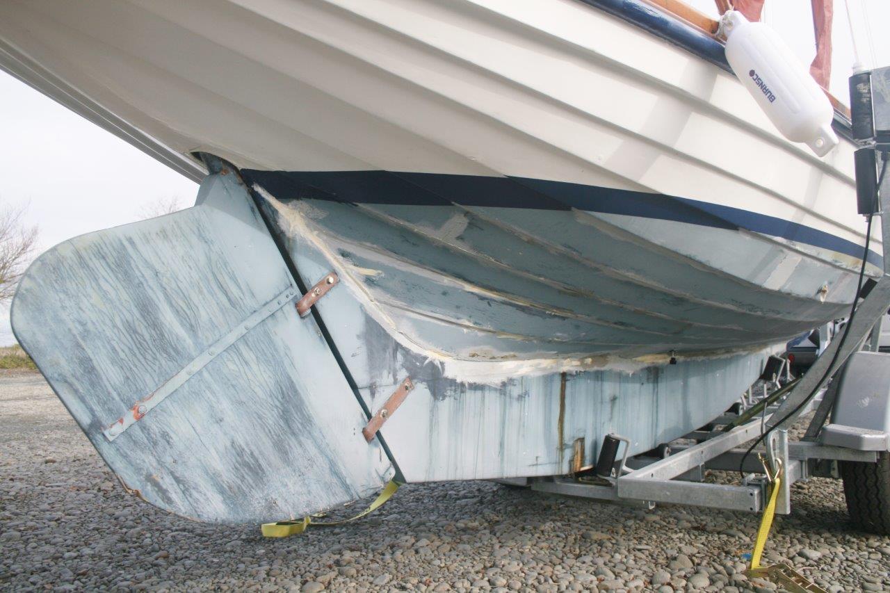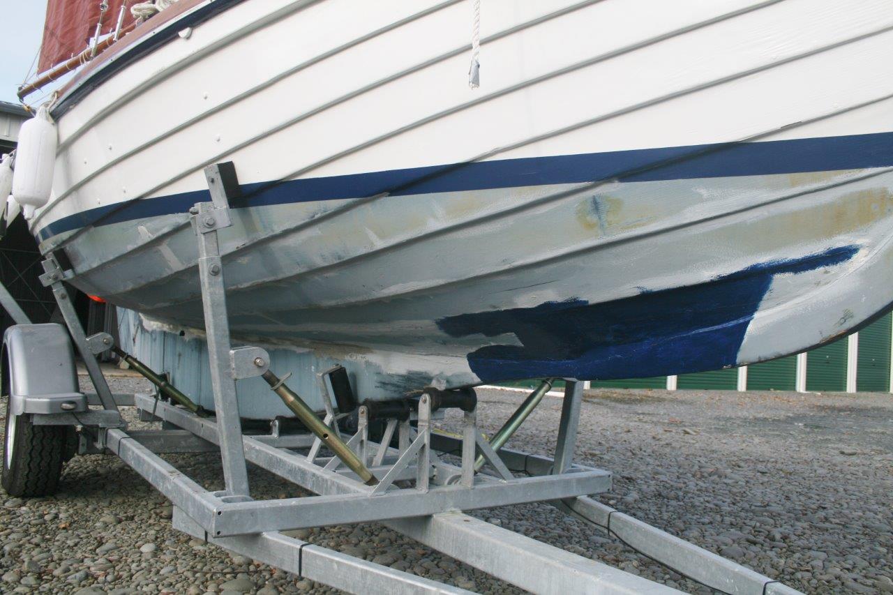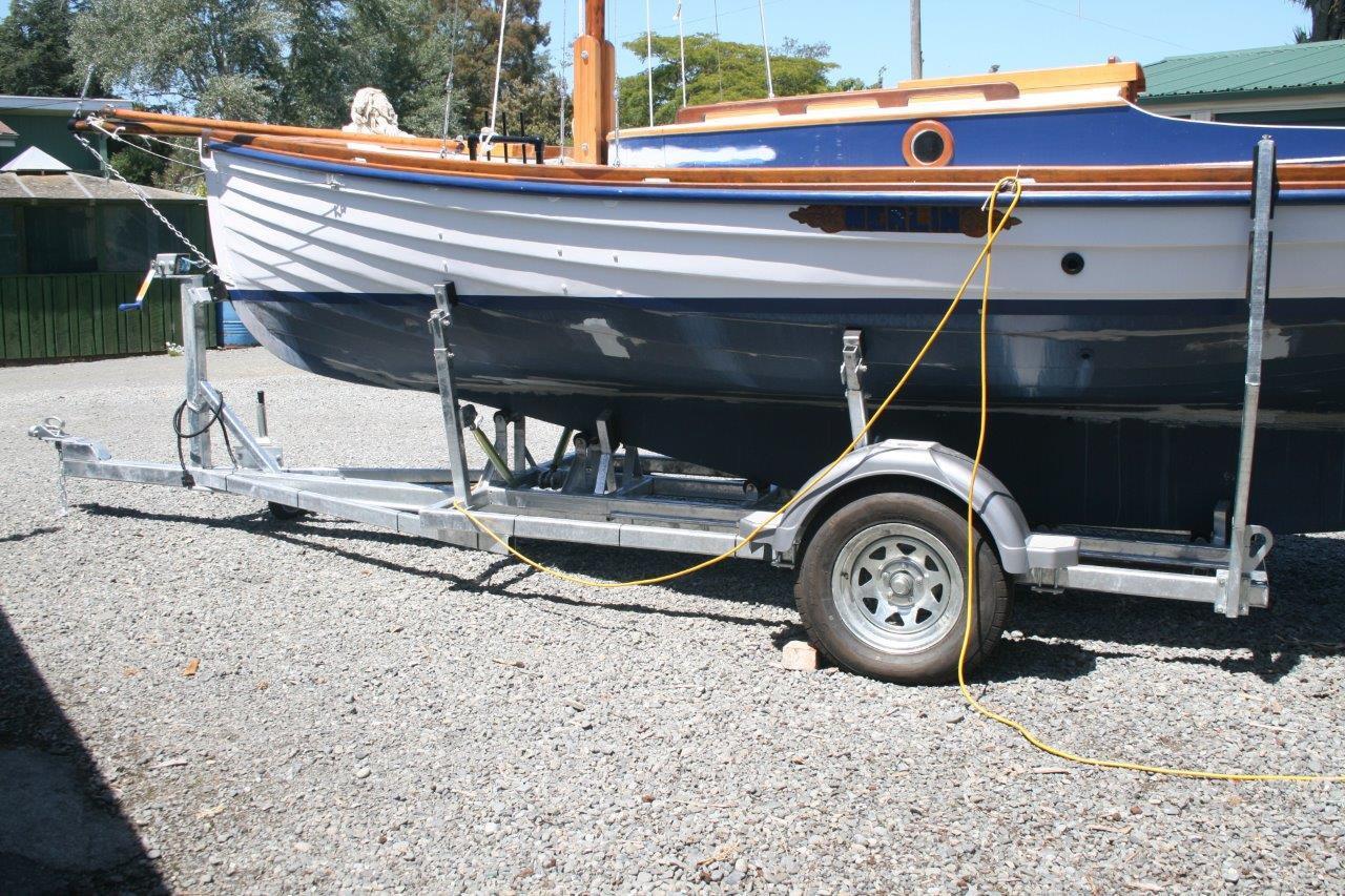 Peter had had her hull restored professionally in Christchurch some time previously, but the earthquakes and his ultimate death intervened. Andrew completed the job, rigged her and commissioned a trailer for her locally. So she’s now, home from the sea in her retirement – converted for use as a ‘trailer-sailor’ and lives protected from the elements in a boat shed at Lake Hood (just east of Ashburton) – where Andrew sails her when time allows.