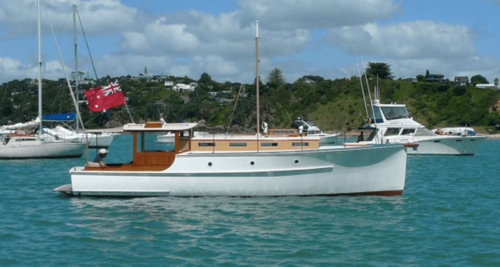 She is visible from Tamaki Drive & is in fact the ex Bay of Islands game fisher – Miss Helen. Built in 1932 by Colin Wild. I have posted restored & ‘old’ photo as a comparison for you – I like the effort that has gone into keeping / making her very original.