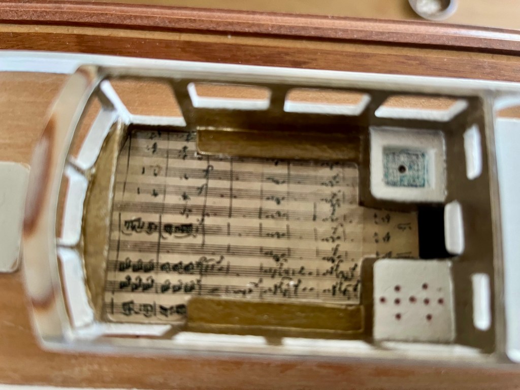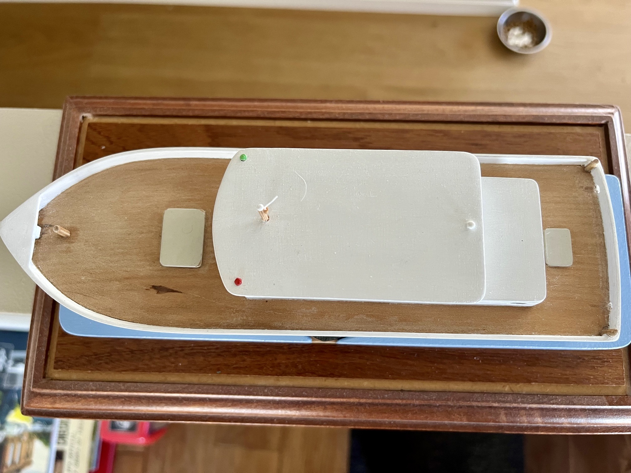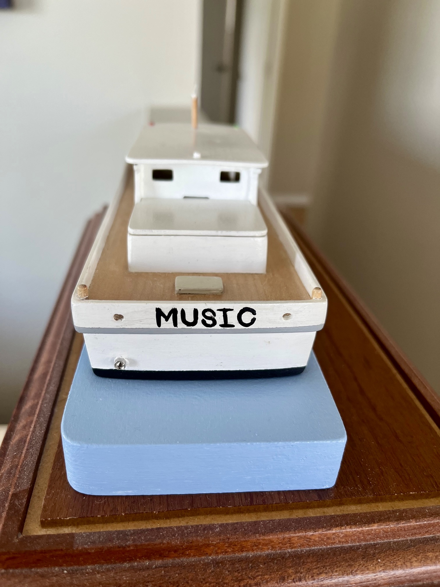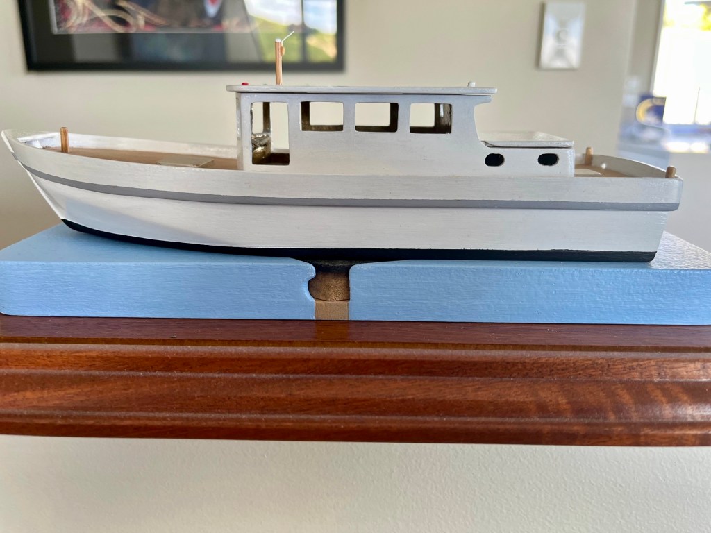The launch – Music was built from scratchy Neville and his daughter Marie commented that as a family they spent many hours in the boat shed building her. Unfortunately Music later caught fire and burnt to the waterline. Neville managed to get his hands on some of the burnt timber and made a scale model incorporating the timber into the finished piece, refer below photos.