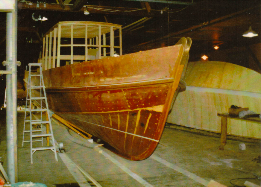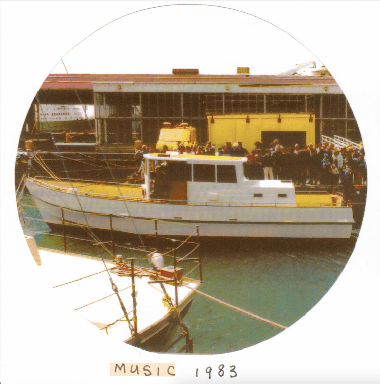 “My first memory of Dad’s boat building was when he built a speedboat in our garage. He named it Cee Bee II and was very successful in his racing days.The first boat Dad built was “Marco Polo”, built in our backyard for some local fishermen. Next was Music, built from scratch, as a family we spent many hours in the boat shed building her. Unfortunately she caught fire and burnt to the waterline. Dad managed to get his hands on some of the burnt timber and made a scale model incorporating the timber into the finished piece. After Music, and I think I’ve got the order correct, was Harmony, Souza, Largo and finally Coda. Jim Carey, previously from Picton, built the hull for Harmony and it was sailed across and finished in Wellington by Dad, and possibly another but I can’t remember sorry. Coda was purchased in Picton, the wheelhouse was removed and rebuilt by Dad, giving it his look and practicality.“