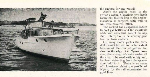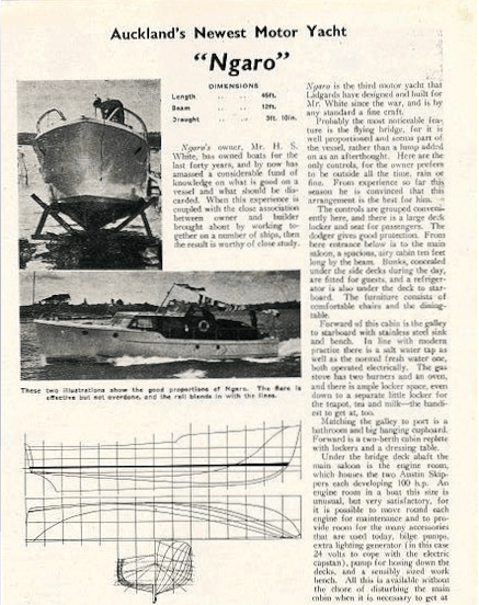 You would have to look long and hard to find a classic woody in as original condition and as highly presented as the 1953, 48’ Lidgard built launch Ngaro. Scroll down to the b/w press clippings below, showing her as launched. One well respected woody once said “Its one of the few boats that, in my opinion looks better with painted coamings than the original varnish”.