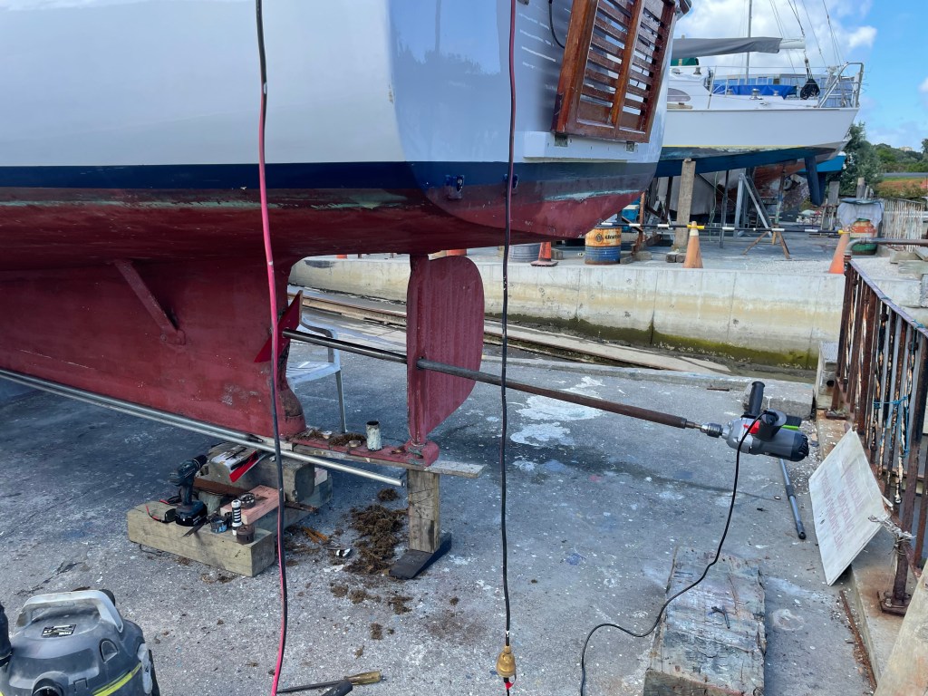 “Bit of an update is due after Pacific’s most recent haul. In past attempts, the prop shaft wasn’t able to be drawn out more than 150mm so I had always been nervous about the situation up there. This time with the help of Seagar Marine and The Slipway Milford, we by brute force and a makeshift large slide hammer removed the shaft. It was found to be pitted, and then very badly pitted in one section where she ran in a highly noble bronze bush about tube centre. Three bearings were subsequently rammed out; one lignum vitae, one fibrous and one bronze. The Tube was found to be thin walled gunmetal and had almost completely de-zinced to mush. The mystery bitumen bath on the keelson was found to be a crude repair some decades old, hiding bad corrosion. A boring bar was made from the old 3.6m tail shaft extended to 5m and with unholy effort the remnants were removed and the hole gradually bored out to accept a fibreglass stern tube. This tube was epoxied in, with two Vesconite and one rubber cutless bearing installed, topped off by a Chatfields blue water dripless seal.