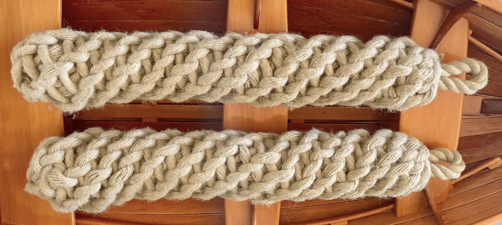 One of John’s many talents is making traditional rope fenders. John very kindly made a pair for my launch RAINDANCE – see below. + link to how to make the fenders https://waitematawoodys.com/2021/05/01/classic-rope-fenders-how-to/